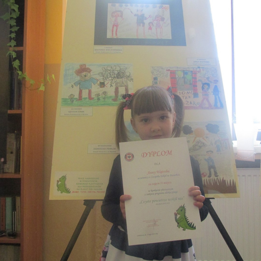 Spory sukces odniosła także drugoklasistka – Oliwia Wątroba- zdobywając II miejsce w XV edycji Wojewódzkiego Konkursu Literacko – Plastycznego „Jan Paweł II – Patron Najgodniejszy” w kategorii praca plastyczna (Ząb 2016). W tej samej kategorii wyróżnienie otrzymała Natalia Duchnik, także uczennica klasy drugiej szkoły podstawowej. Drugie wyróżnienie w tym konkursie, tym razem jednak w kategorii praca literacka zdobył Kacper Florek – uczeń klasy piątej.