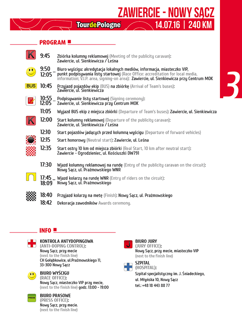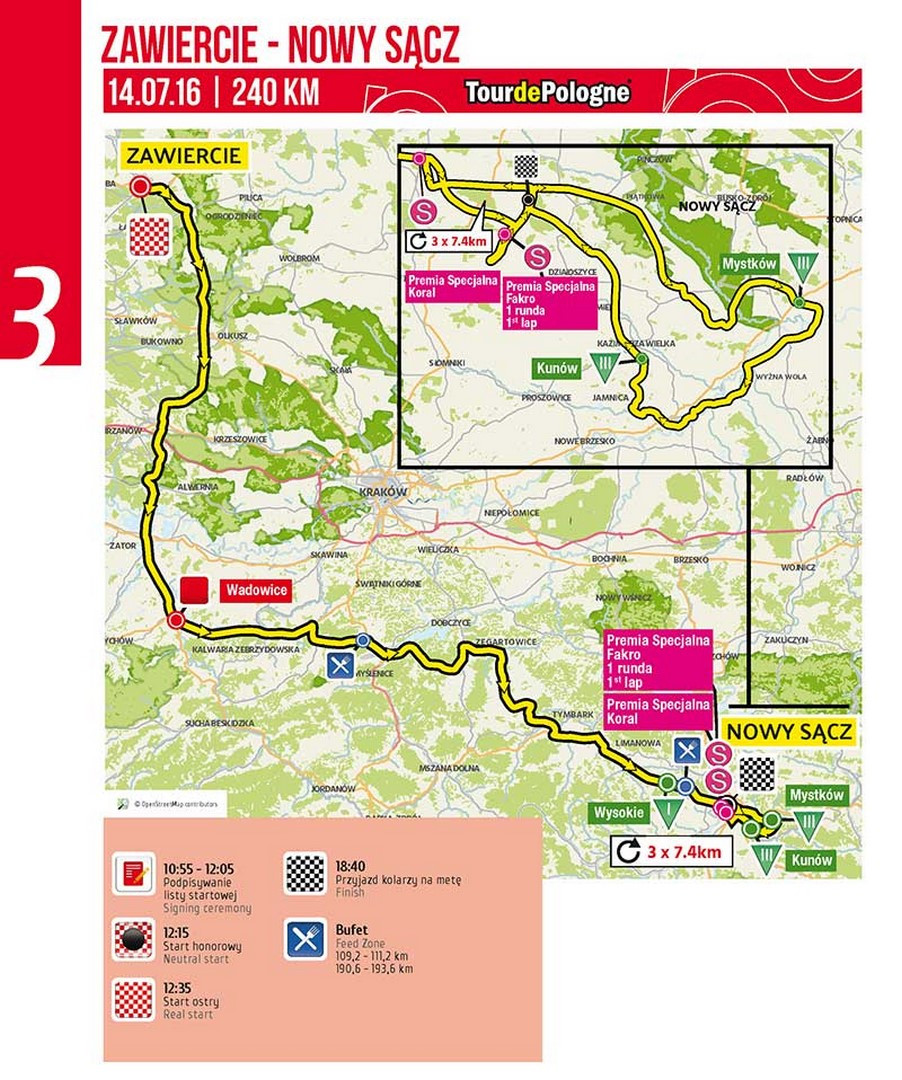 Trzeci dzień wyścigu to prawdziwy maraton – etap z Zawiercia do Nowego Sącza liczy aż 240 kilometrów. Na początku trasy kolarze będą mogli podziwiać uroki wyjątkowej Jury Krakowsko-Częstochowskiej i powalczą na lotnej premii w Wadowicach. Druga część etapu, to coraz więcej wzniesień i trzy górskie premie: Wysokie, Mystków i Kunów. Po wjeździe do Nowego Sącza na peleton czeka Premia Specjalna Koral, Premia Specjalna Fakro i trzy rundy po 7,4 km.