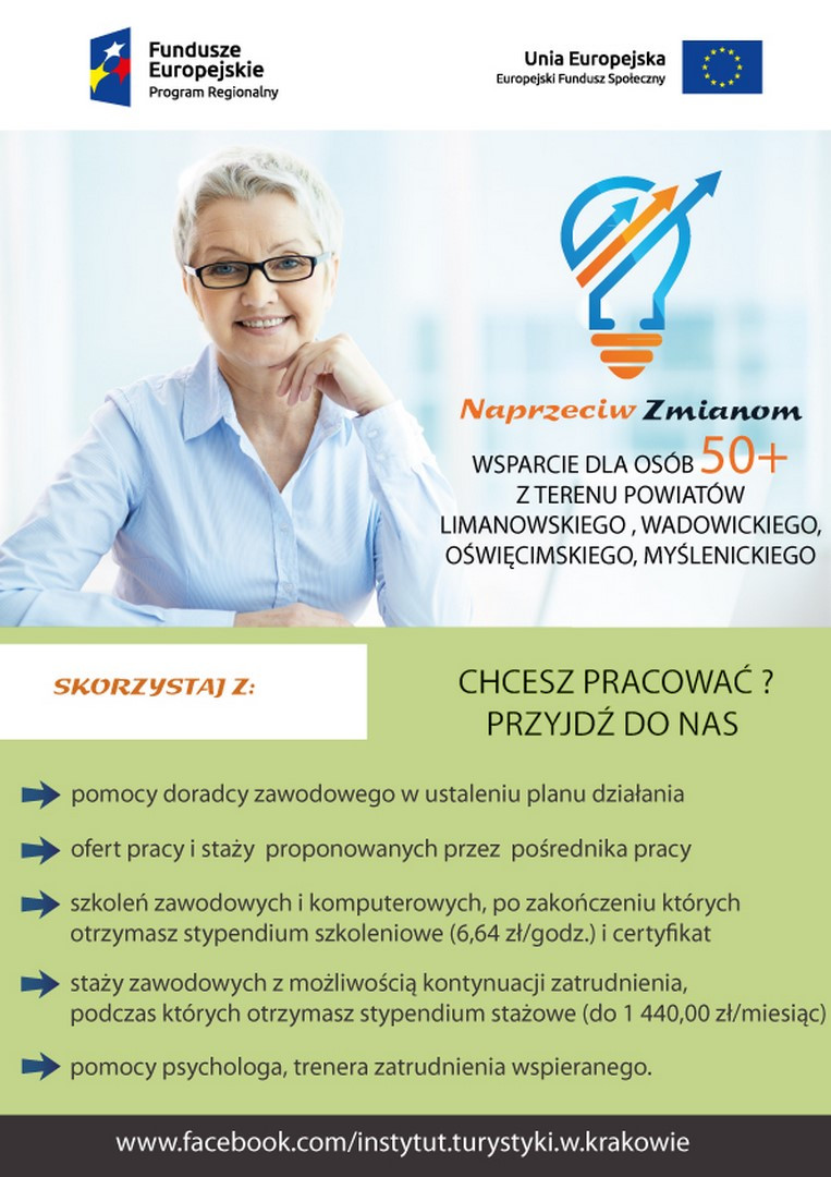 Uprzejmie informujemy, że Gmina Limanowa we współpracy z Instytutem Turystyki w Krakowie realizuje projekt pn. „Naprzeciw zmianom” , który uzyskał dofinansowanie na realizację działań aktywizacyjnych dla osób poszukujących pracy, w ramach Regionalnego Programu Operacyjnego Województwa Małopolskiego na lata 2014-2020, Poddziałanie 8.2 Aktywizacja Zawodowa.
