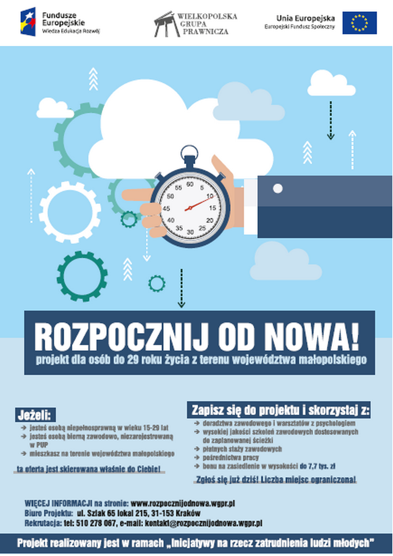 Oficjalny serwisTrwa nabór uczestników i uczestniczek do projektu „Rozpocznij od nowa! - projekt dla osób do 29 roku życia z terenu województwa małopolskiego” realizowanego przez Wielkopolską Grupę Prawniczą Kozłowski, Maźwa, Sendrowski i Wspólnicy sp. k. w ramach Programu Operacyjnego Wiedza Edukacja Rozwój, Priorytet I. Osoby młode na rynku pracy, Działanie 1.2 Wsparcie osób młodych pozostających bez pracy na regionalnym rynku pracy, Poddziałanie 1.2.2 Wsparcie udzielane z Inicjatywy na rzecz zatrudnienia ludzi młodych.
