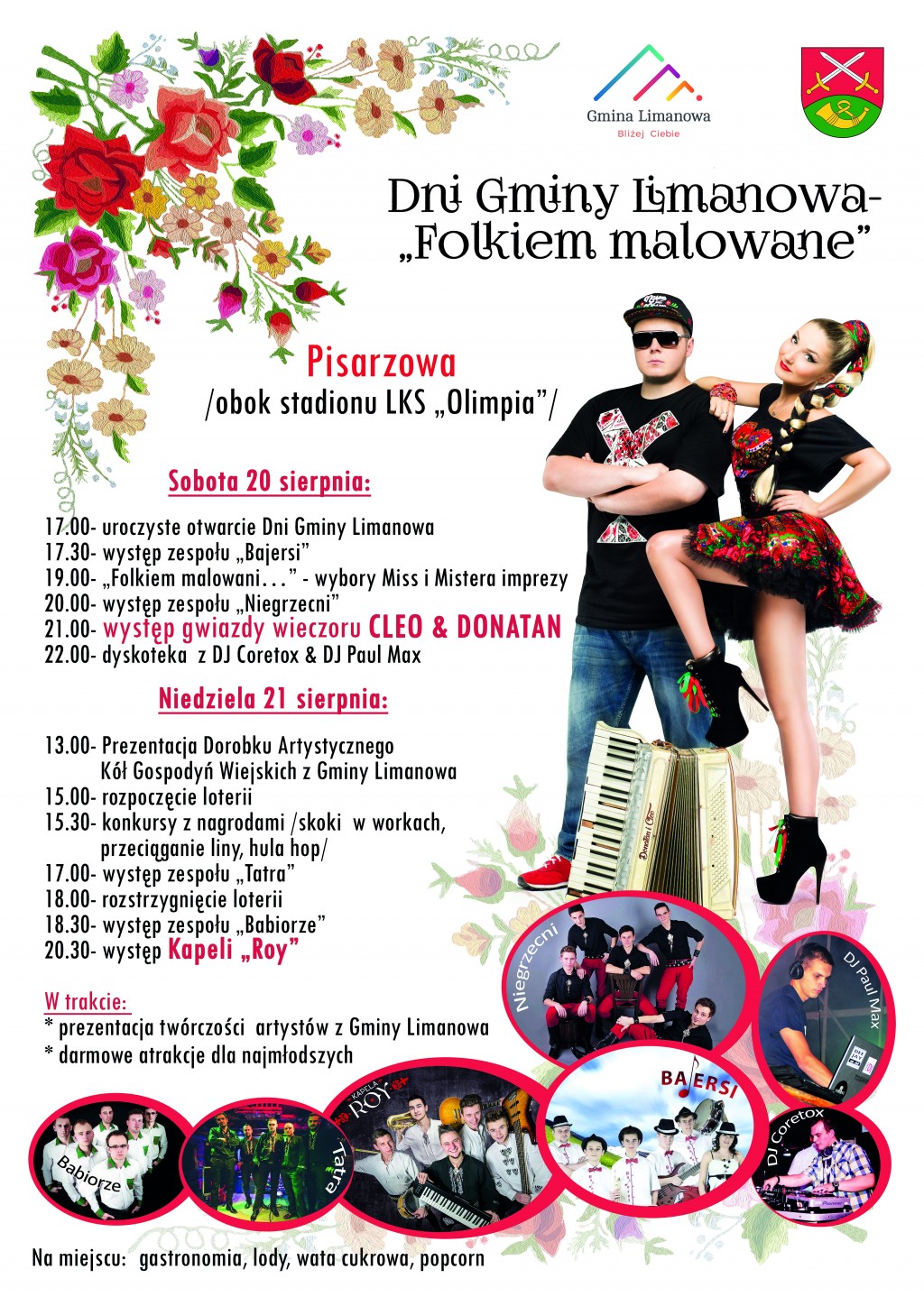 Oficjalny serwisW dniach 20-21 sierpnia br. w Pisarzowej obok stadionu sportowego LKS „Olimpia” Gmina Limanowa obchodzić będzie swoje święto. Dwudniowa uroczystość utrzymana zostanie w klimacie folkowym pod hasłem „Dni Gminy Limanowa – Folkiem malowane”.