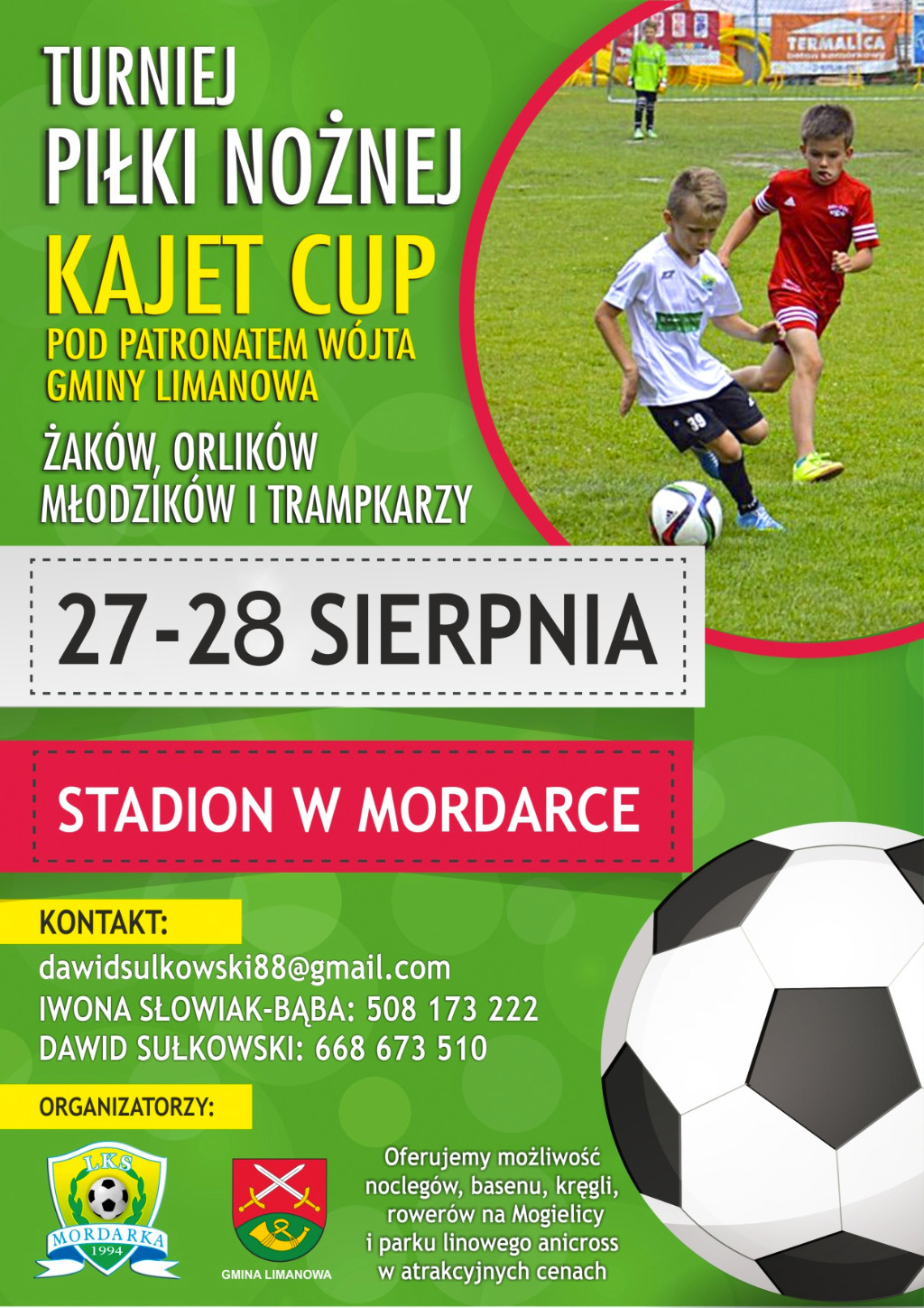 Oficjalny serwisW dniach 27-28 sierpnia 2016r odbędzie się dwudniowy turniej piłki nożnej „Kajet Cup” organizowany przez LKS Mordarka pod patronatem Wójta Gminy Limanowa. Turniej zostanie rozegrany w czterech kategoriach wiekowych: