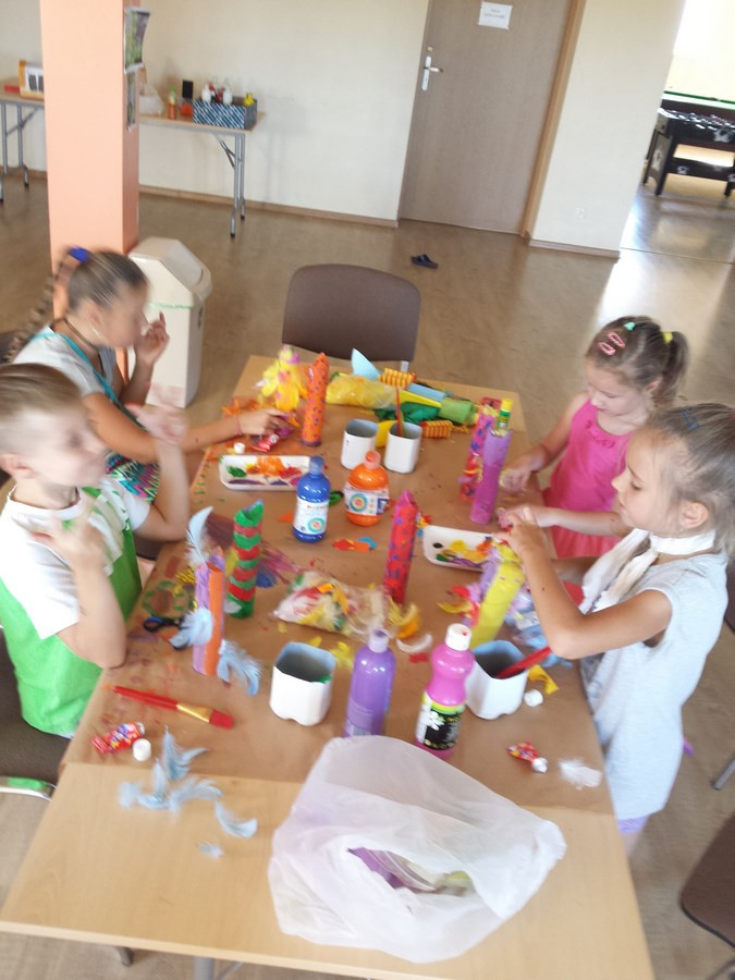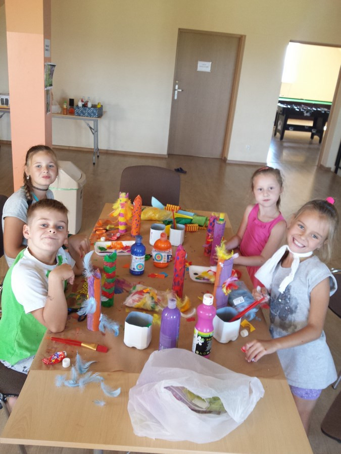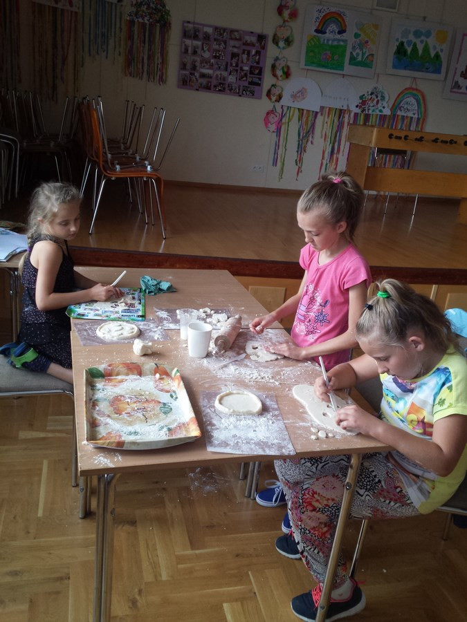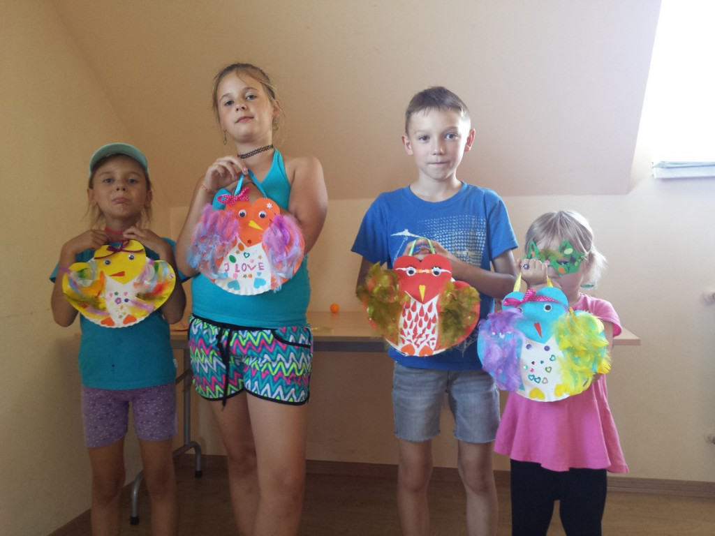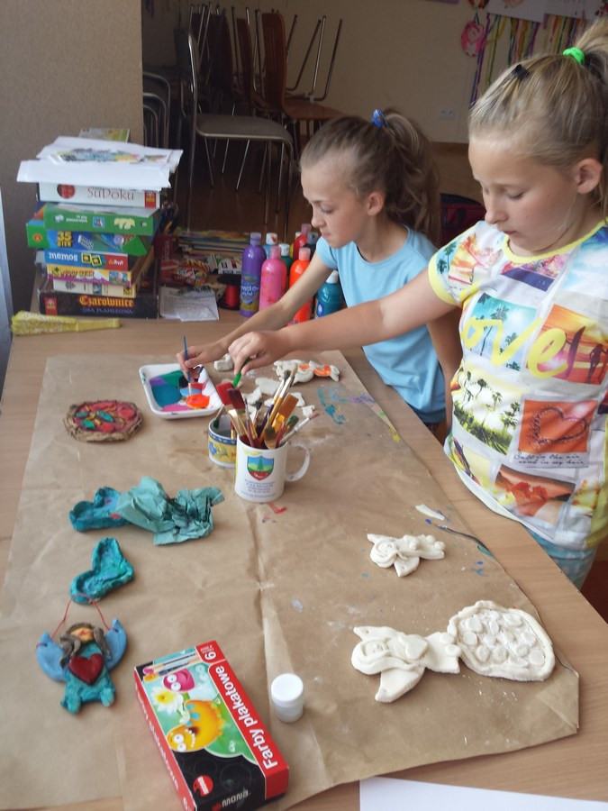 W trakcie jednych z wakacyjnych spotkań dzieci miały okazję przygotować masę solną, z której powstały kolorowe aniołki. Pomysłowość podopiecznych przełożyła się na wspaniały efekt końcowy w postaci wielokolorowych figurek. Mimo, że najmłodsi włożyli sporo pracy w wykonanie swoich dzieł to zadowolenie i satysfakcja była jeszcze większa.