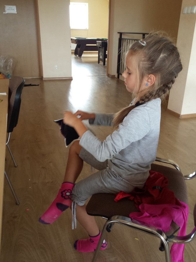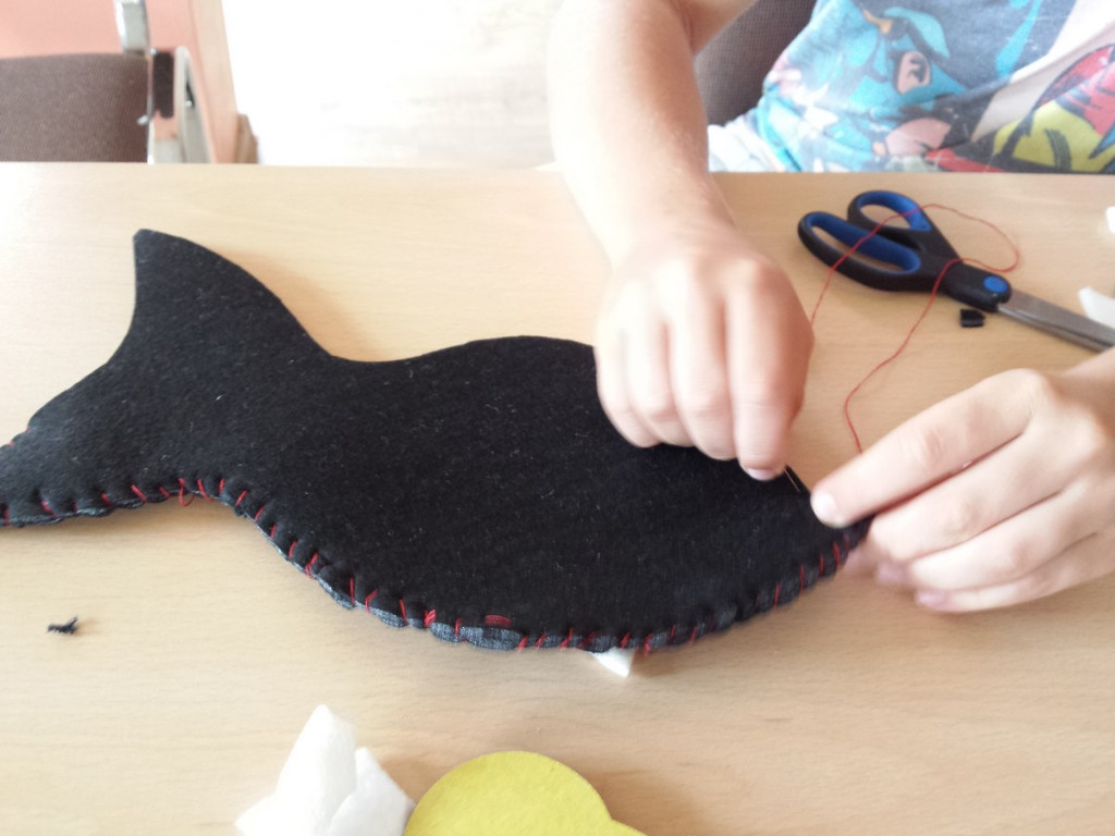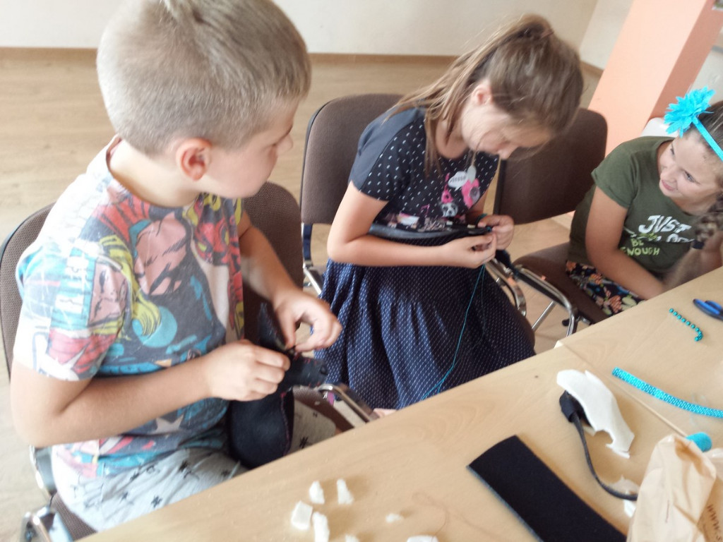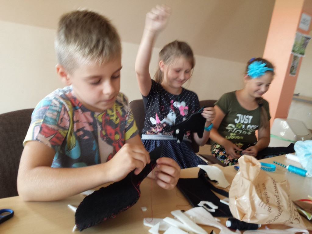 Wakacje zakończyły się szyciem zwierzątek z filcu. Dzieci za pomocą kawałka materiału, igły i nitki uszyły swojego ulubionego pupila, wśród, których znalazł się kot z kokardą, rybka oraz pies z niebieska peleryną.