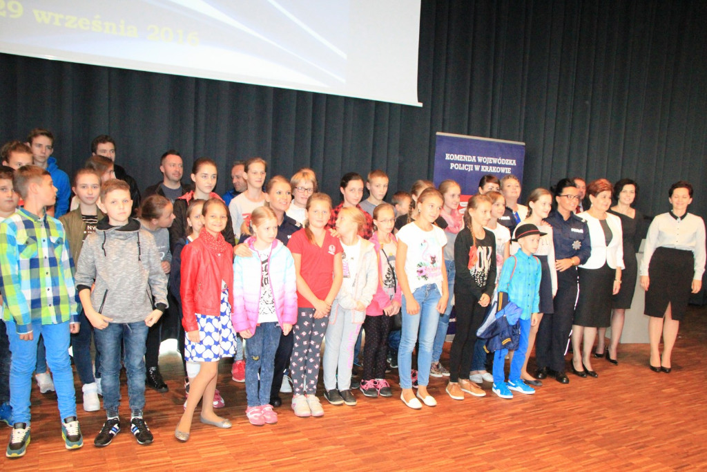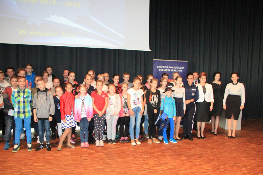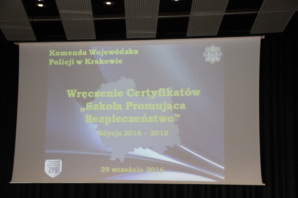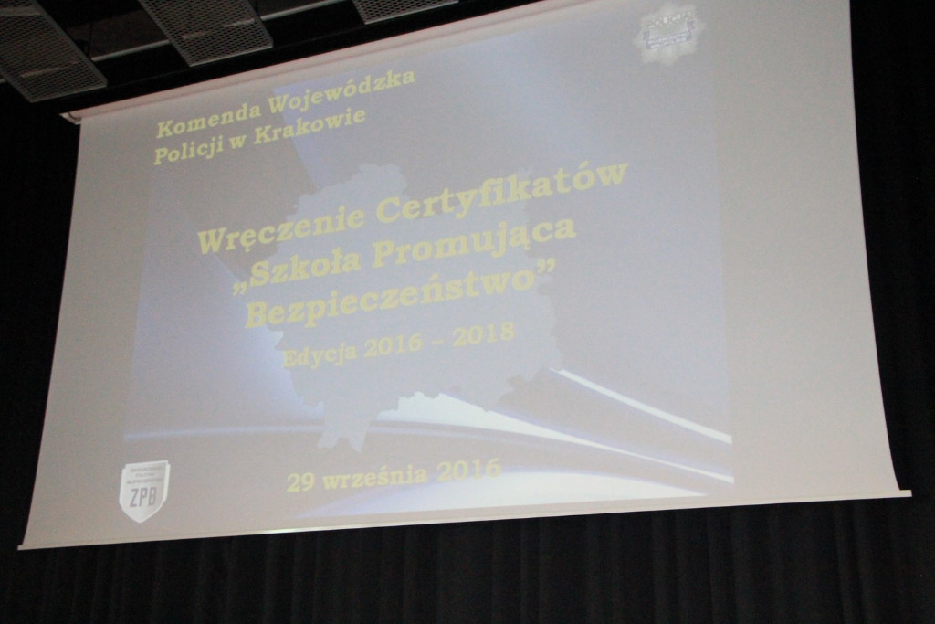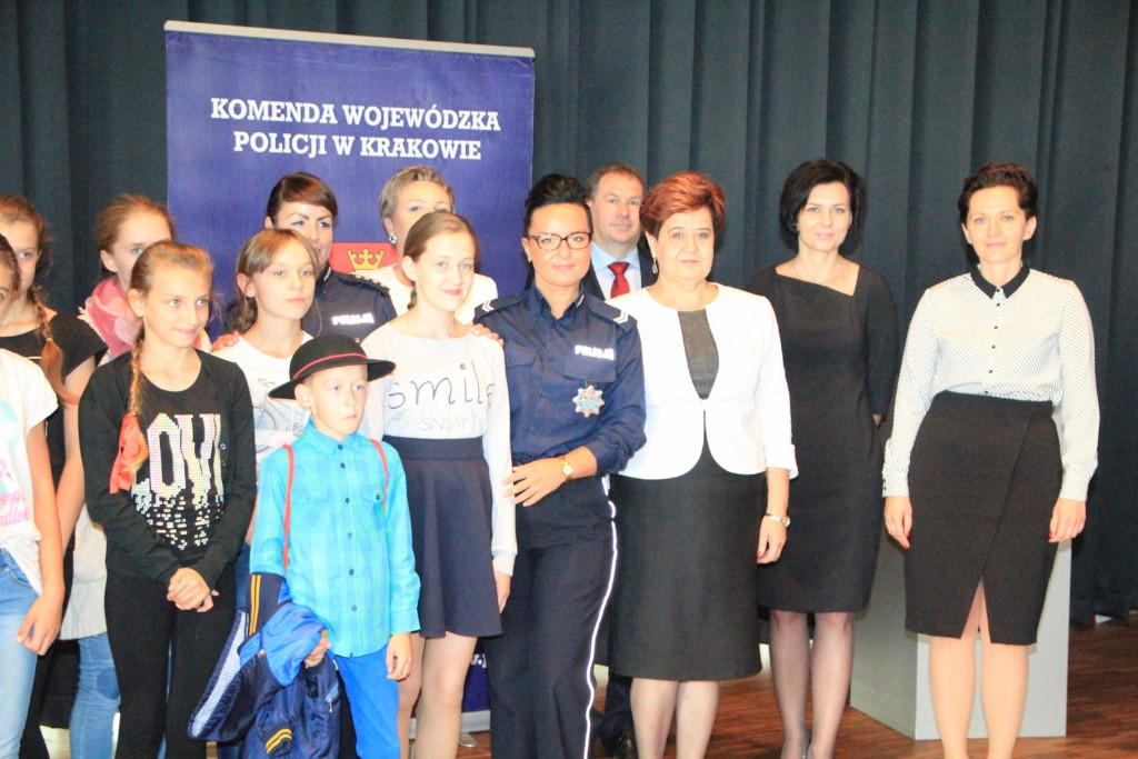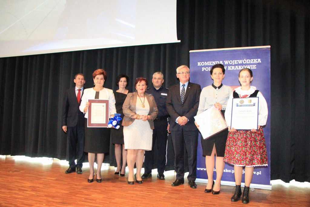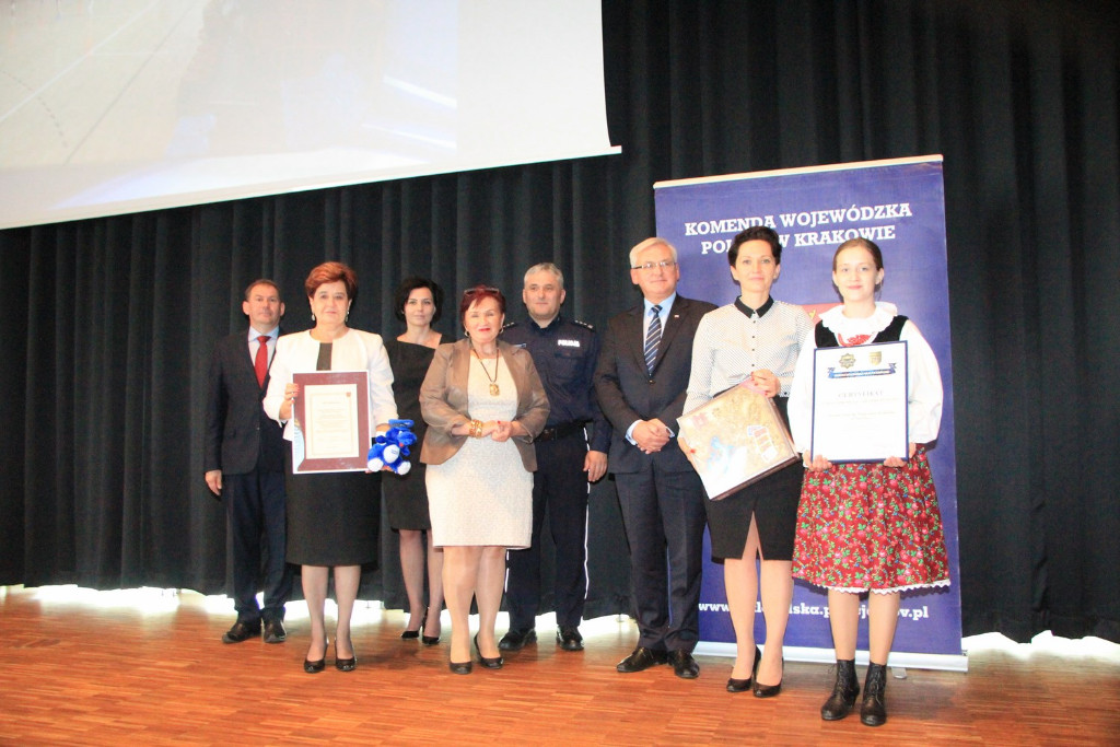 Certyfikat w imieniu Zespołu Szkół w Pasierbcu z rąk Komendanta Wojewódzkiego Policji insp. Roberta Strzeleckiego oraz Małopolskiego Wicekuratora Oświaty Haliny Cimer odebrali Dyrektor Rozalia Kuchta, nauczyciel koordynator projektu Alicja Banat oraz przedstawiciel Samorządu Uczniowskiego Dorota Pałka.