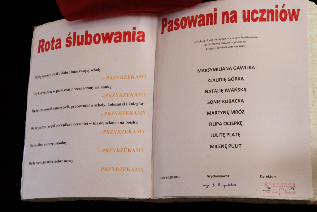 Oficjalny serwisDnia 14 października br. uczniowie pierwszych klas Szkoły Podstawowej w Wysokiem zostali uroczyście włączeni w szeregi „braci uczniowskiej”. Uroczystość powiązana była z obchodami Święta Szkoły oraz Dniem Patrona Szkoły Królowej Jadwigi.