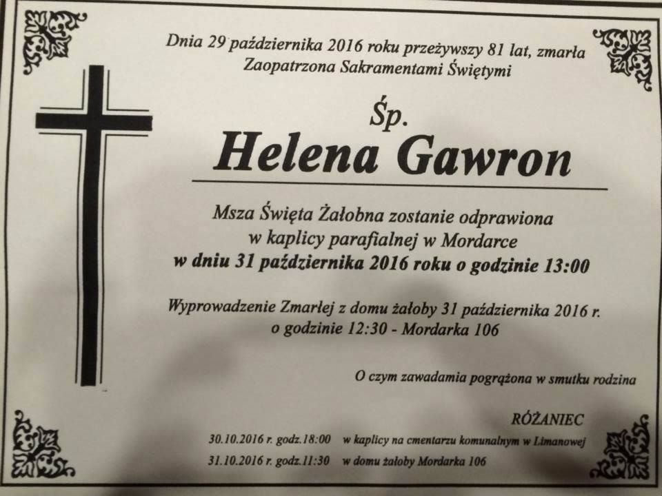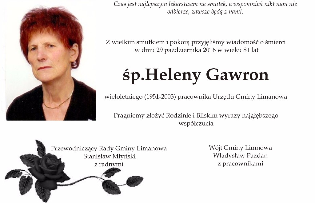 Z wielkim smutkiem i pokorą przyjęliśmy wiadomość o śmierci w dniu 29 października 2016 w wieku 81 lat śp. Heleny Gawron wieloletniego (1951-2003) pracownika Urzędu Gminy Limanowa.