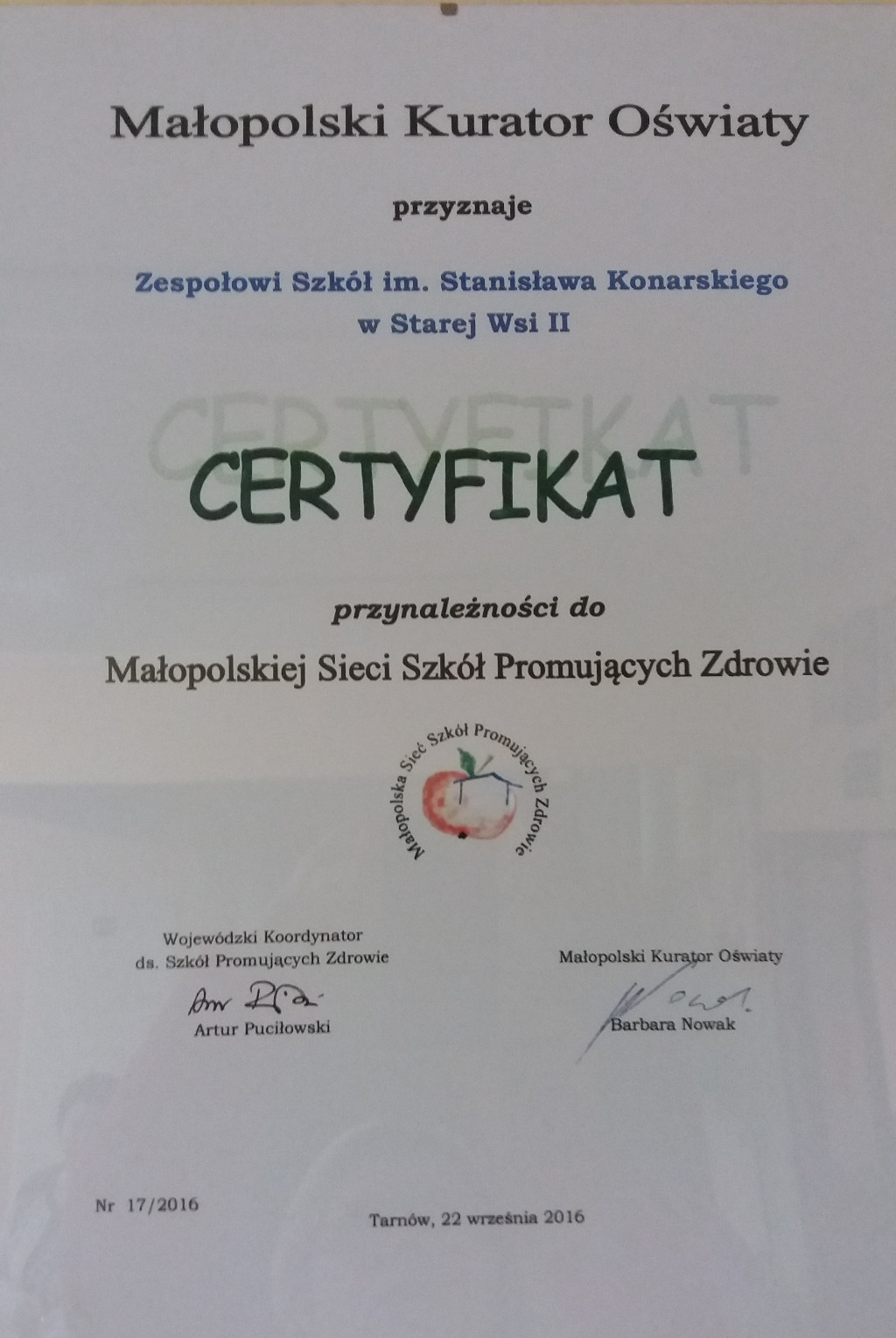 Oficjalny serwisPo kilkuletnim kandydowaniu do Sieci Szkół Promujących Zdrowie, dzięki intensywnej działalności całej społeczności szkolnej na rzecz zdrowia, Zespół Szkół im. Stanisława Konarskiego w Starej Wsi II otrzymał Wojewódzki Certyfikat Szkoły Promującej Zdrowie.