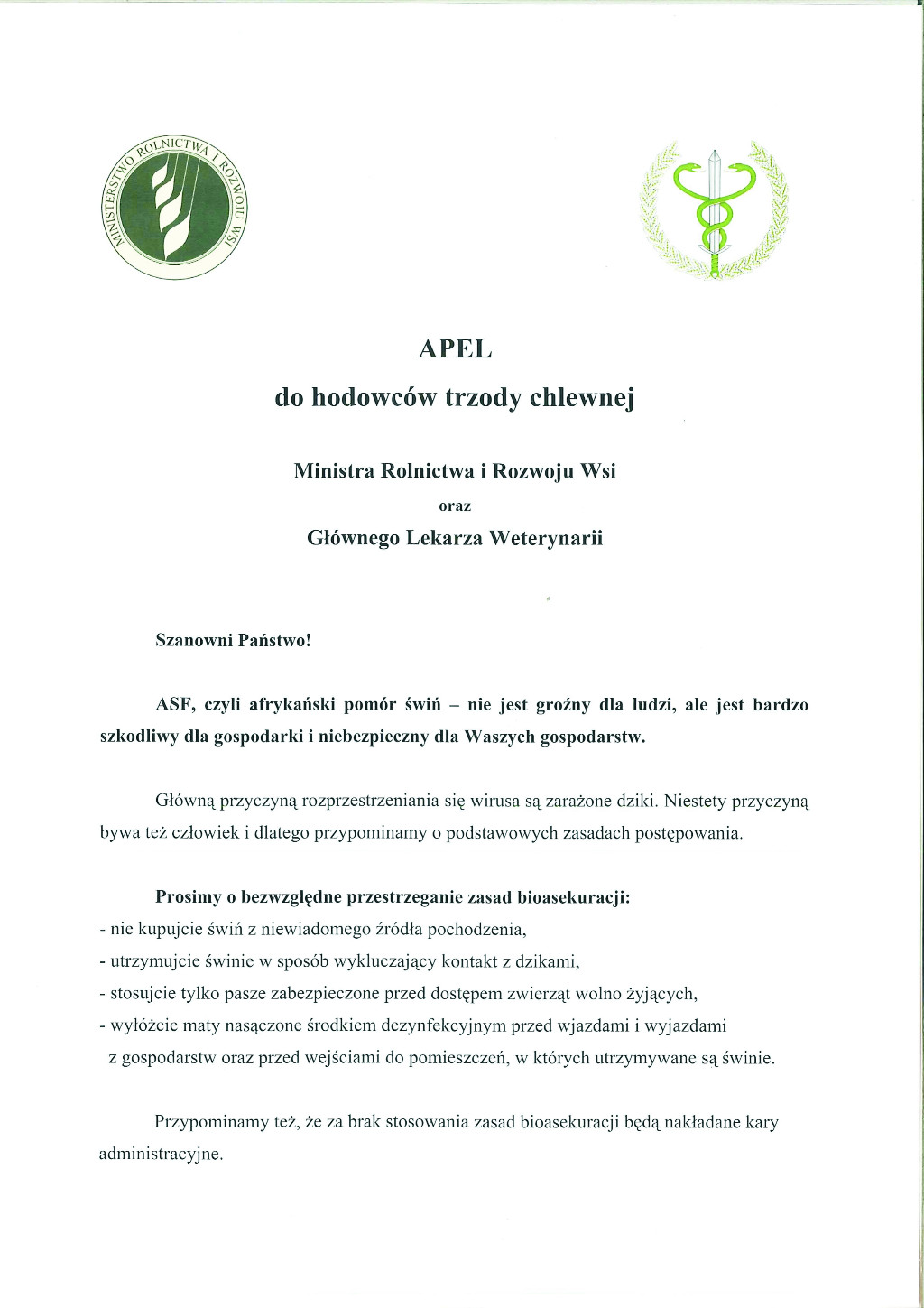 Oficjalny serwisApel Ministra Rozwoju Wsi i Głównego Lekarza Weterynarii do hodowców trzody chlewnej – ASF czyli Afrykański Pomór Świń nie jest groźny dla ludzi, ale bardzo szkodliwy dla gospodarki i niebezpieczny dla gospodarstw.
