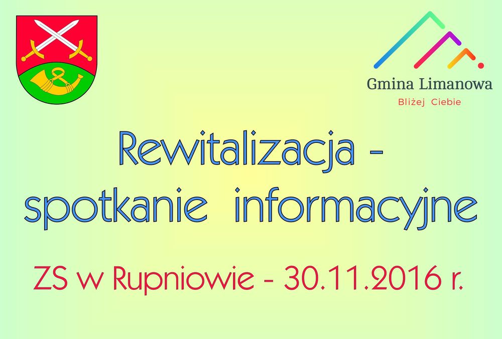 Oficjalny serwisInformujemy, że w środę 30 listopada 2016 r. o godz. 13.30 w Zespole Szkół w Rupniowie odbędzie się spotkanie informacyjno-konsultacyjne dotyczące przystąpienia przez Gminę Limanowa do opracowania Gminnego Programu Rewitalizacji.