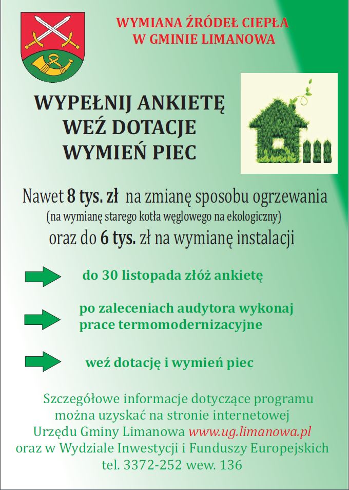 Oficjalny serwisOd 7 listopada br. mieszkańcy gminy limanowa będą mogli złożyć wstępną deklarację uczestnictwa w projekcie, umożliwiającym wymianę pieców i urządzeń grzewczych w indywidualnych gospodarstwach domowych.
