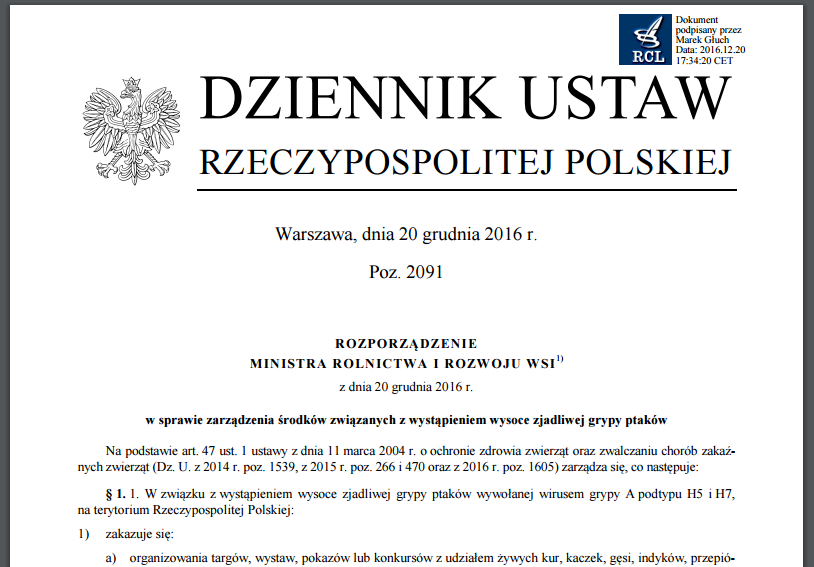 Powiatowy Lekarz Weterynarii w Limanowej informuje o wejściu w życie przepisów rozporządzenia Ministra Rolnictwa i Rozwoju Wsi z dnia 20 grudnia 2016 roku w sprawie zarządzenia środków związanych z wystąpieniem wysoce zjadliwej grypy ptaków (Dz.U. poz.2091) od 27 grudnia 2016 roku obowiązują przepisy w w/w rozporządzeniu.