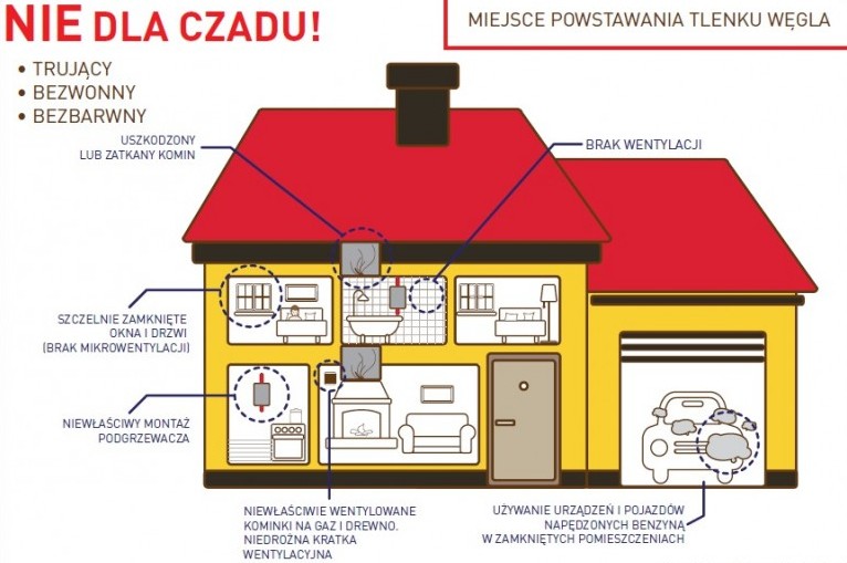 Głównym źródłem zatruć w budynkach mieszkalnych jest niesprawność przewodów kominowych: wentylacyjnych, spalinowych i dymowych. Wadliwe działanie wspomnianych przewodów może wynikać z ich nieszczelności, braku konserwacji, w tym czyszczenia, wad konstrukcyjnych, niedostosowania istniejącego systemu wentylacji do standardów szczelności stosowanych okien i drzwi, w związku z wymianą starych okien i drzwi na nowe.
