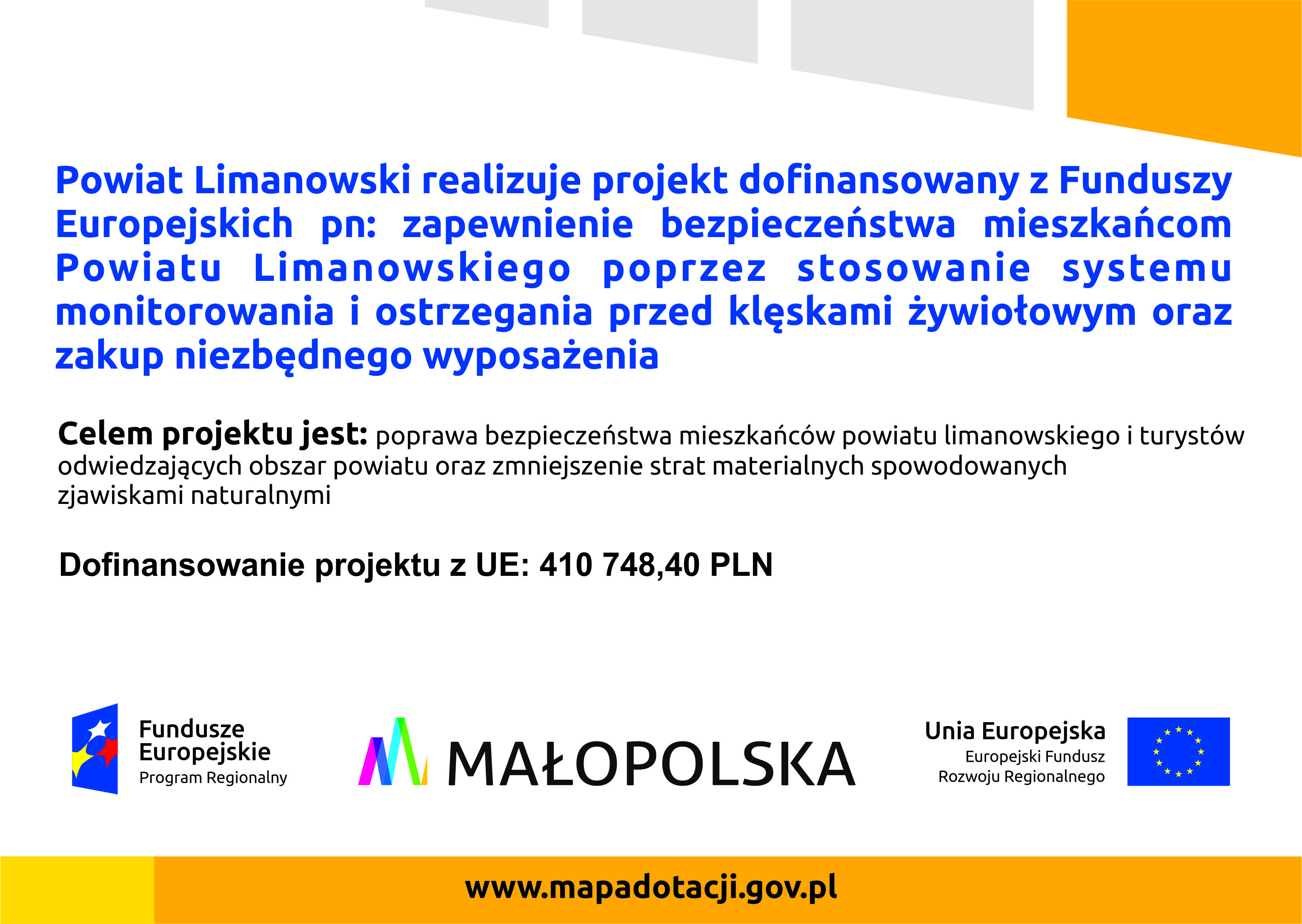 Zapewnienie bezpieczeństwa mieszkańcom Powiatu Limanowskiego poprzez stworzenie systemu monitorowania i ostrzegania przed klęskami żywiołowymi oraz zakup niezbędnego wyposażenia", który otrzymał dofinansowanie w ramach Regionalnego Programu Operacyjnego w Poddziałaniu 5.1.2. Wsparcie służb ratunkowych. Został oceniony