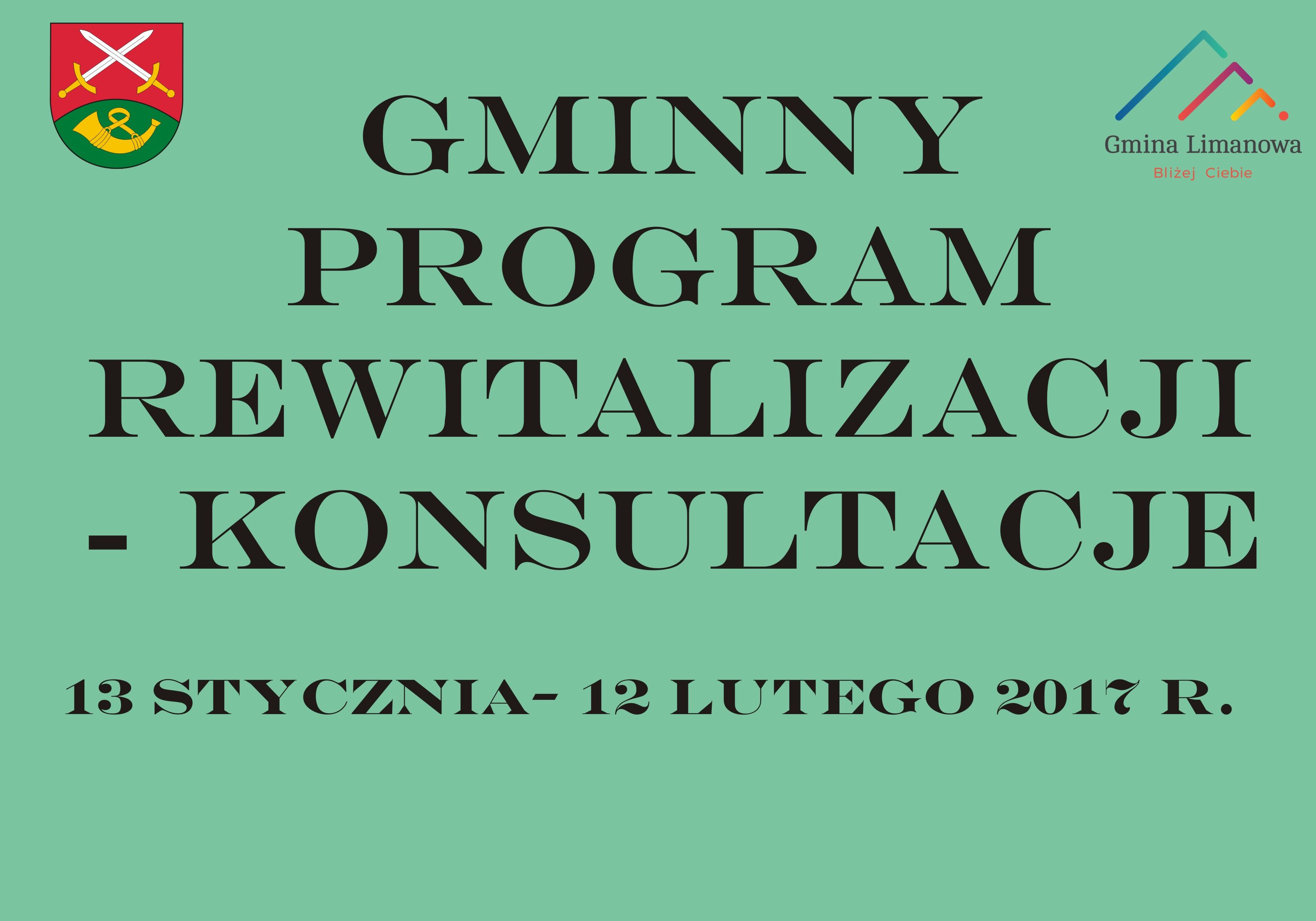 Wójt Gminy Limanowa informuje, że zgodnie z art. 17 ust. 2 pkt 3 Ustawy z dnia 9 października 2015 r. o rewitalizacji (Dz.U. z 2015 r. poz. 1777), w dniu 13 stycznia 2017 r. rozpoczyna konsultacje społeczne projektu Gminnego Programu Rewitalizacji.