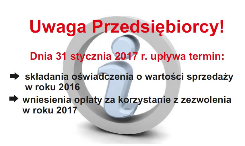 Przypominamy przedsiębiorcom prowadzącym sprzedaż napojów alkoholowych, że z dniem 31 stycznia 2017 r. upływa termin złożenia oświadczenia o wartości sprzedaży oraz wniesienia opłaty za korzystanie z zezwolenia na sprzedaż alkoholu.
