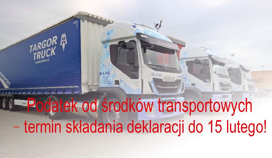 Informujemy, że do dnia 15 lutego 2017 r. osoby fizyczne i osoby prawne będące właścicielami środków transportowych (samochodów ciężarowych o DMC powyżej 3,5 tony, ciągników  siodłowych i balastowych, przyczep i naczep o DMC od 7 ton oraz autobusów) mają obowiązek  złożyć deklarację na podatek od środków transportowych na 2017 r.  oraz dokonać wpłaty I raty podatku.