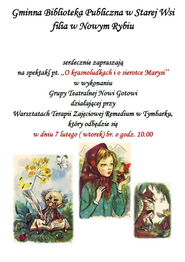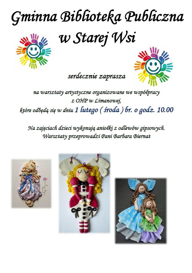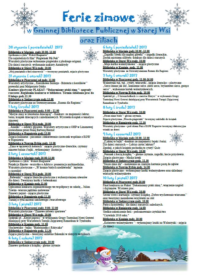 Serdecznie zapraszamy wszystkie dzieci oraz młodzież do spędzenia ferii zimowych w Gminnych Bibliotekach. Nasi bibliotekarze jak zwykle przygotowali bardzo bogatą ofertę zajęć edukacyjnych i zabaw, które są doskonałą alternatywą dla komputera i twórczym sposobem na wykorzystanie wolnego czasu. Będą warsztaty, gry i niespodzianki, zajęcia literackie i plastyczne oraz pokazy filmowe.