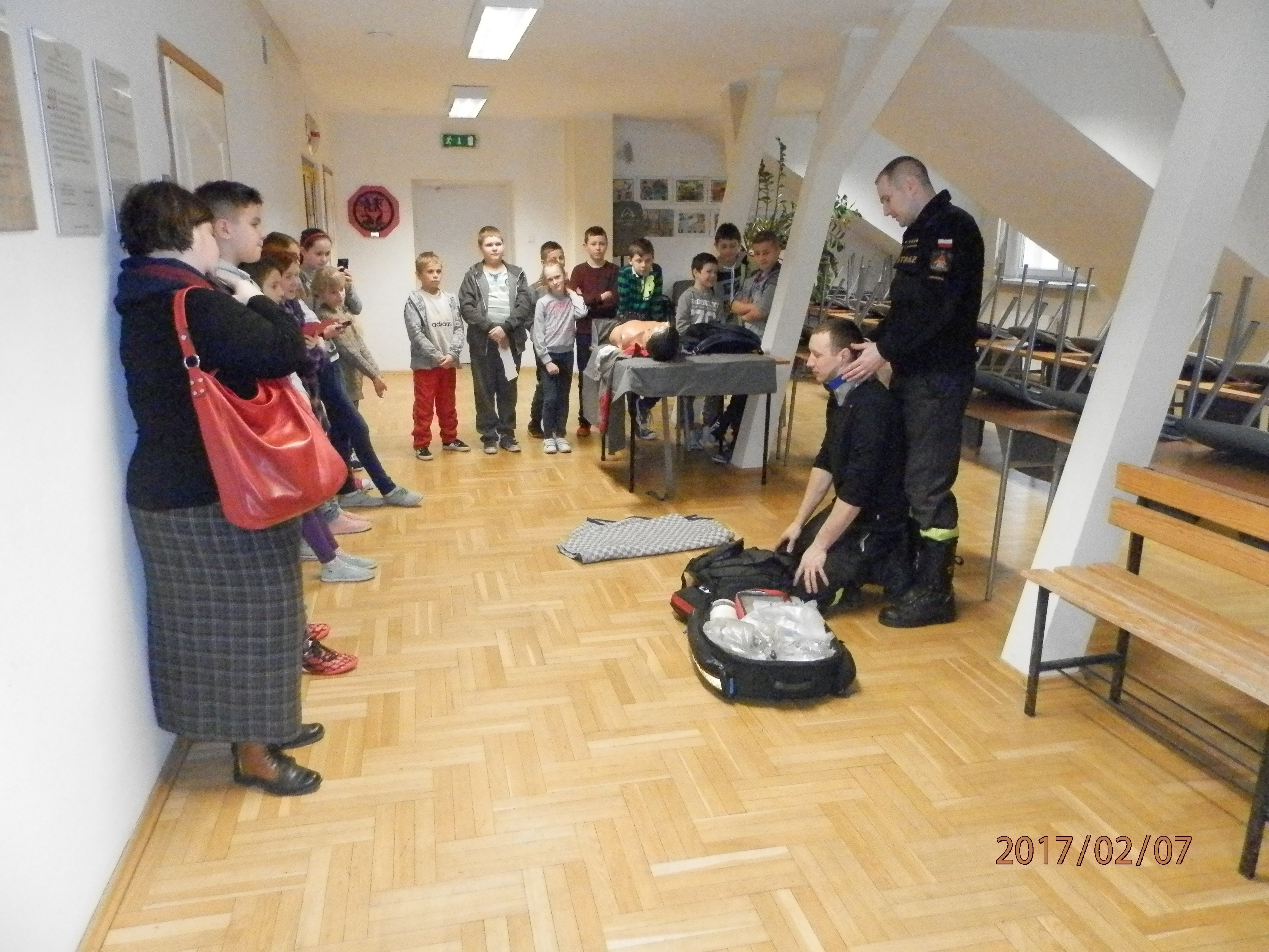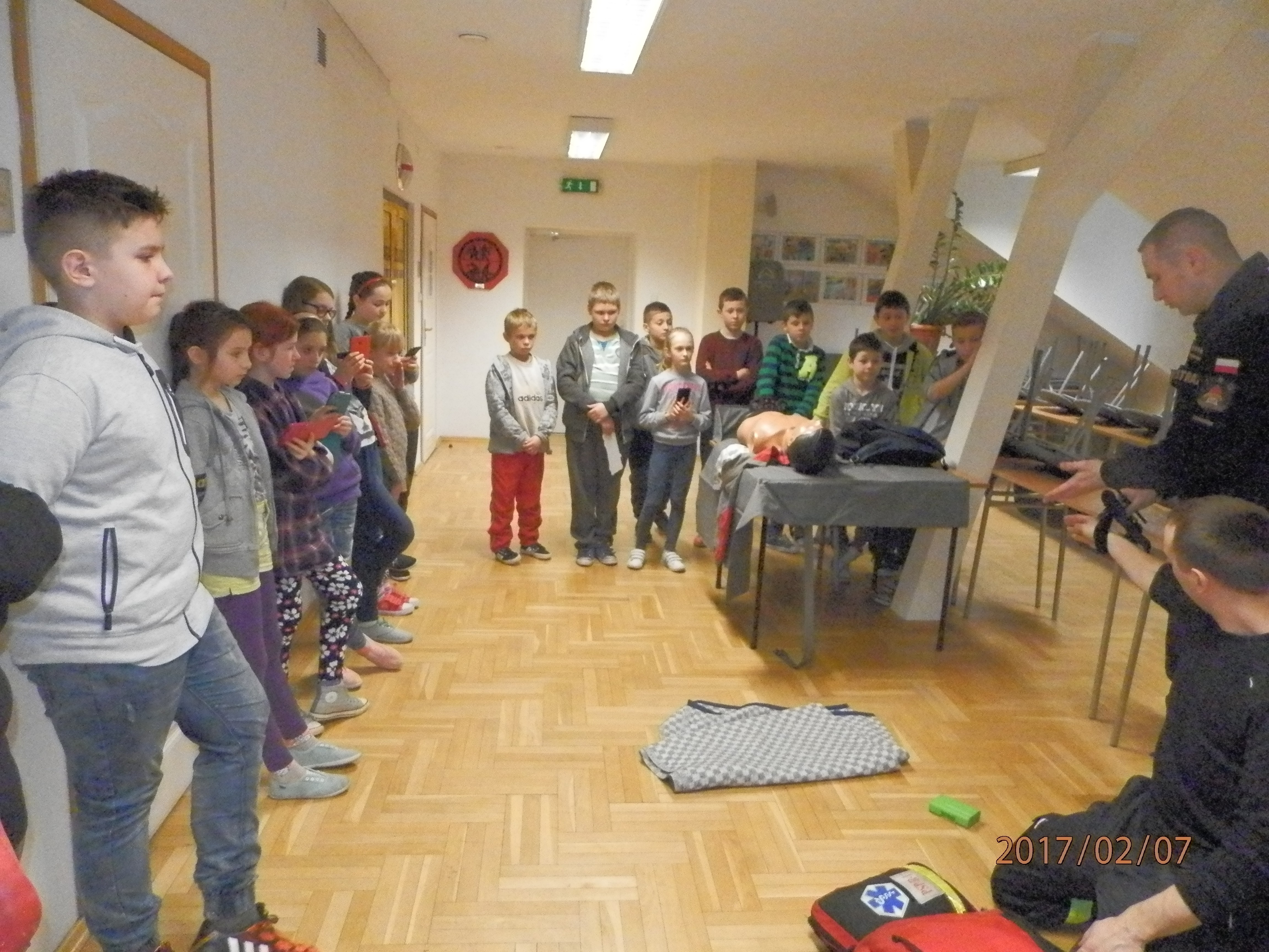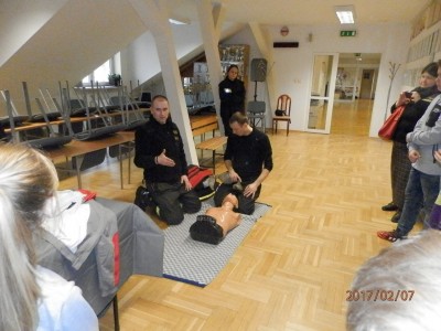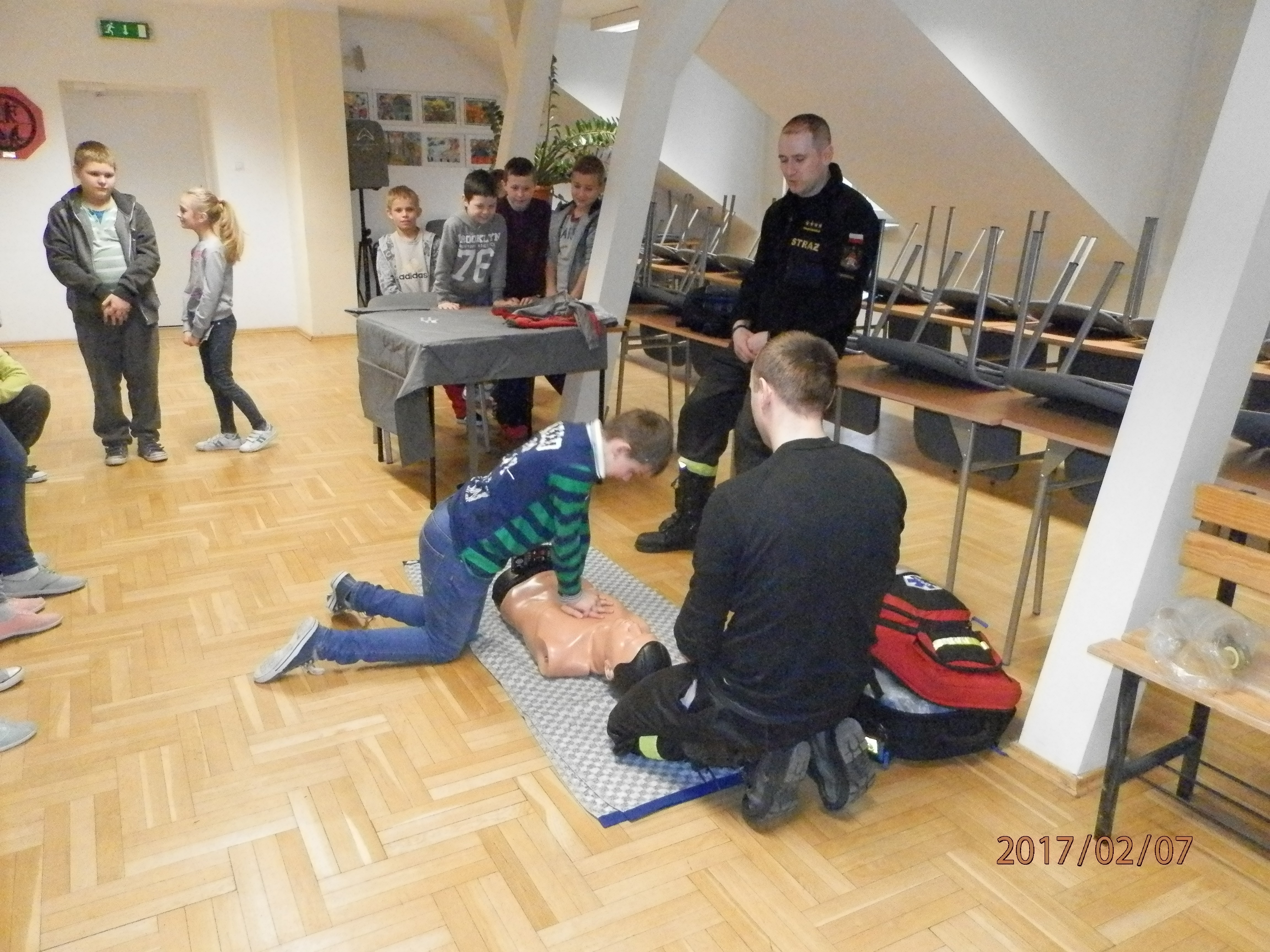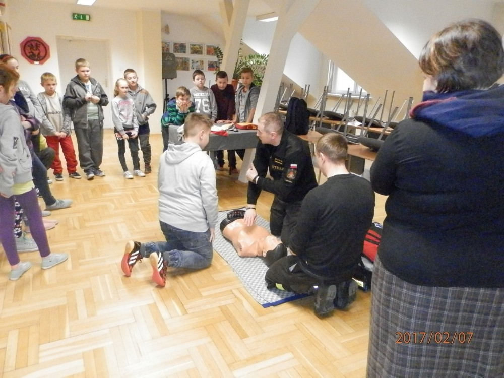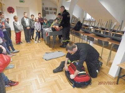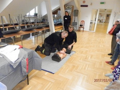 Instruktor przekazał również uczestnikom informacje , jak mają reagować w czasie podejrzenia, że z gazowego urządzenia grzewczego ulatnia się tlenek węgla. Następnym etapem była prezentacja z zakresu udzielania pierwszej pomocy w przypadku zagrożenia życia. Instruktorzy zapoznali uczestników z wyposażeniem medycznym zestawu ratowniczego PSP-R1, zademonstrowali jak działa defibrylator oraz do czego służy i kiedy należy go stosować. Chętni uczestnicy mogli na miejscu wykorzystać zdobytą wiedzę jak prawidłowo i skutecznie udzielić pierwszej pomocy w przypadku zatrzymania akcji serca i braku oddechu.