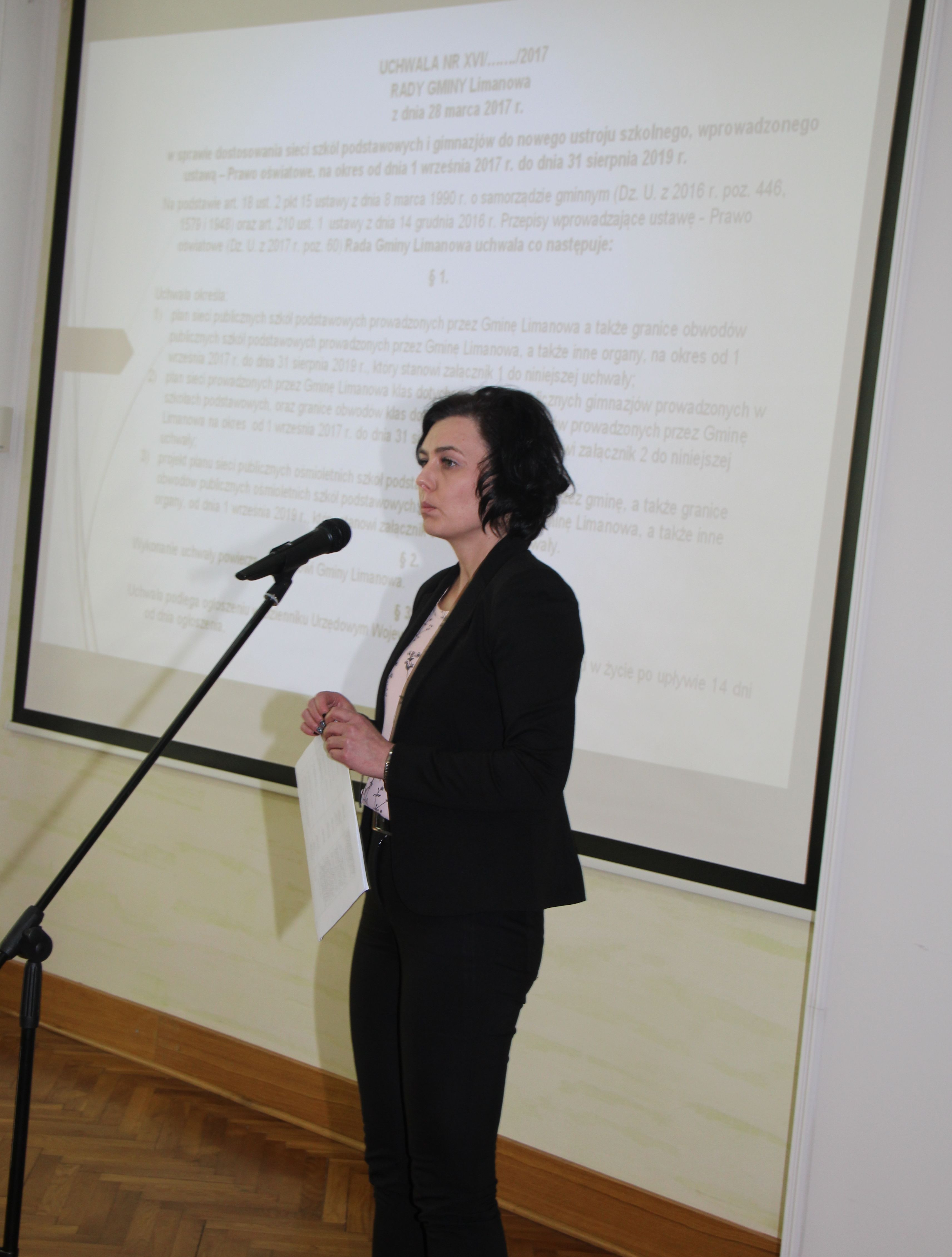 Dyrektor Gminnego Zespołu Obsługi Szkół - Edyta Król przekazała informację na temat zmian oświatowych, szczegółowo przedstawiając uchwały dotyczące: