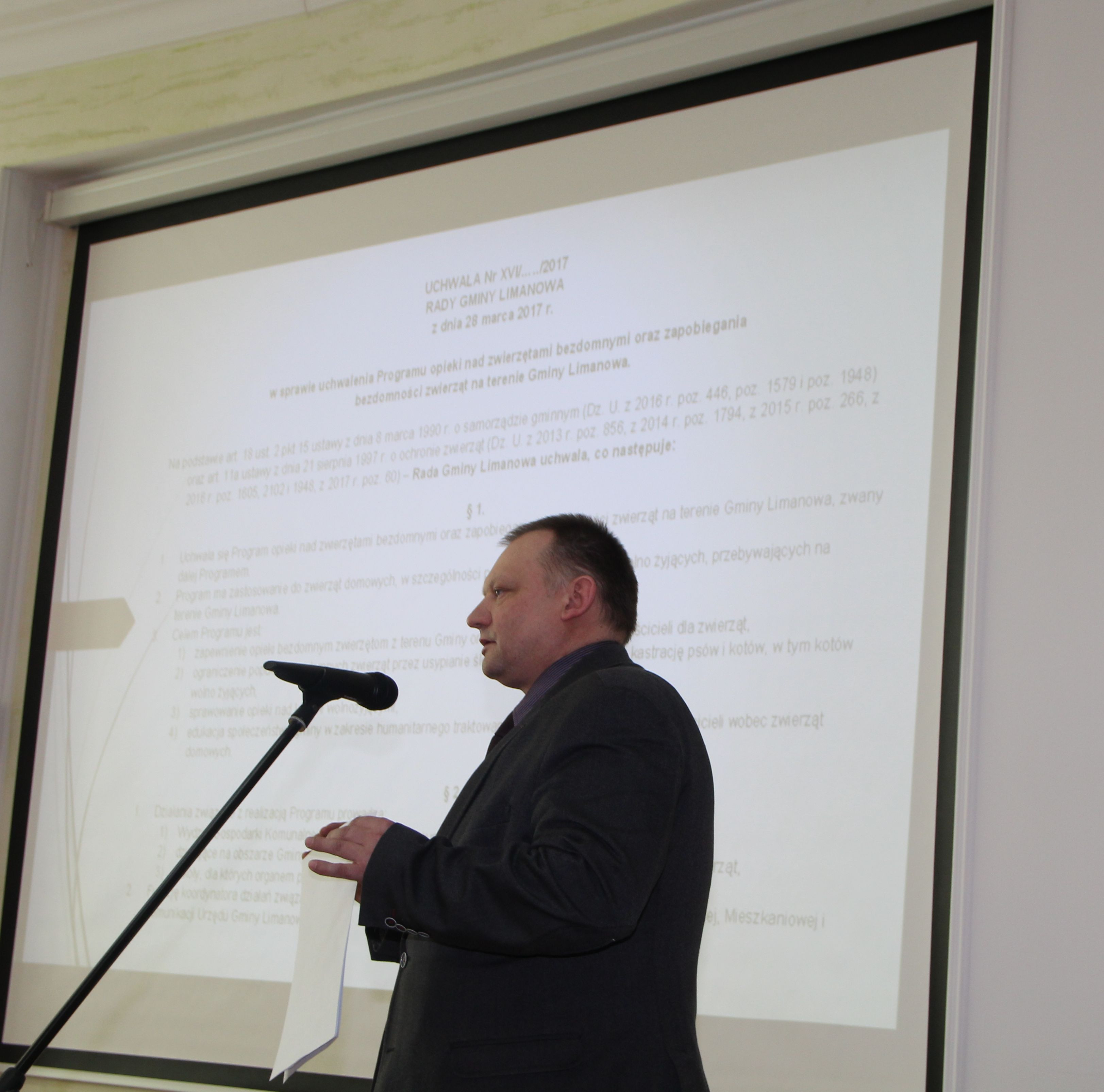 Następnie kwestie uchwalanego Programu opieki nad zwierzętami bezdomnymi oraz zapobiegania bezdomności zwierząt na terenie Gminy Limanowa omówił Kierownik Wydziału Gospodarki Komunalnej, Mieszkaniowej i Komunikacji -