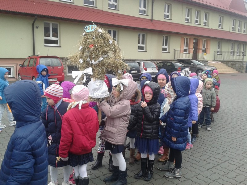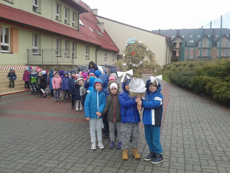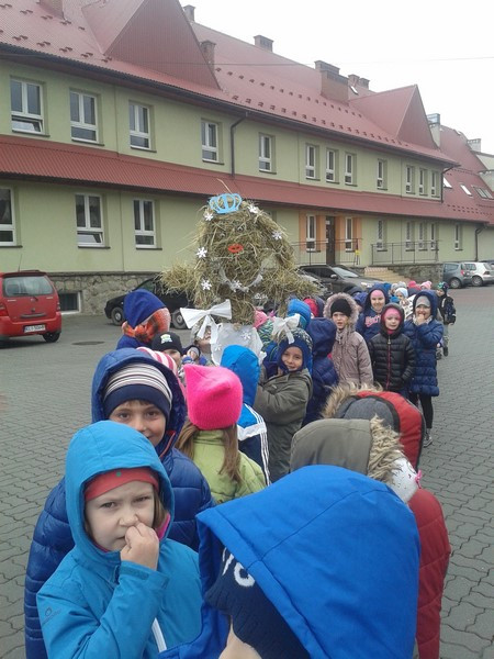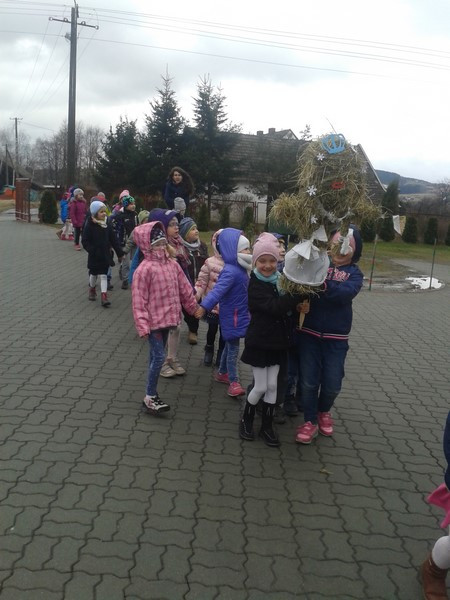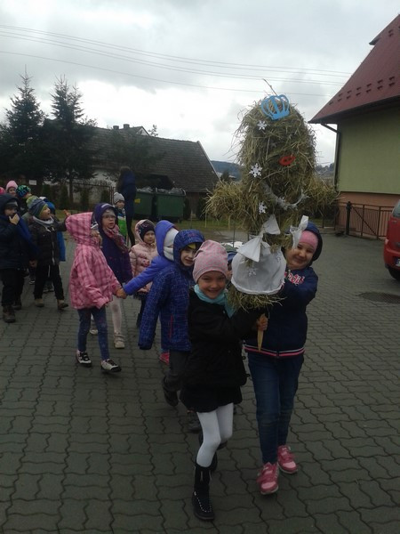 Dzieci z klas zerowych również przygotowały piękną Marzannę. Mimo niesprzyjającej pogody postanowiły raz na zawsze pożegnać zimę. Pełne nadziei, że dzięki podjętym działaniom będą mogły cieszyć się wiosennym słońcem, wyruszyły ze szkoły na paradę wokół placu.
