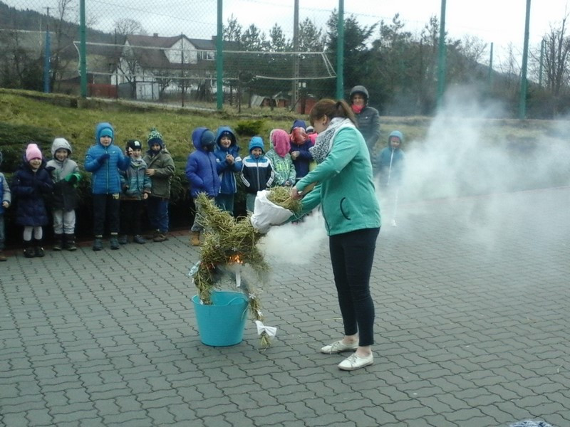 Żegnając symbol zimy, postanowili ogrzać atmosferę podpalając kukłę, a następnie mając na uwadze dobro naszego środowiska- utopić ją w misce wody. Zadanie to jednak okazało się nie łatwe ze względu na wiejący wiatr, który uniemożliwiał zapalenie Marzanny. Po wielu próbach jednak się udało, a dzięki tym zabiegom już dziś mogliśmy cieszyć się piękną słoneczną pogodą. Mamy nadzieję, że wiosna już na stałe u nas zagości, ciesząc nasze oczy budzącą się do życia naturą. Dla przypomnienia tradycja topienia lub palenia Marzany to znany polski zwyczaj, który miał chronić przed szybkim powrotem krótkich i burych dni.