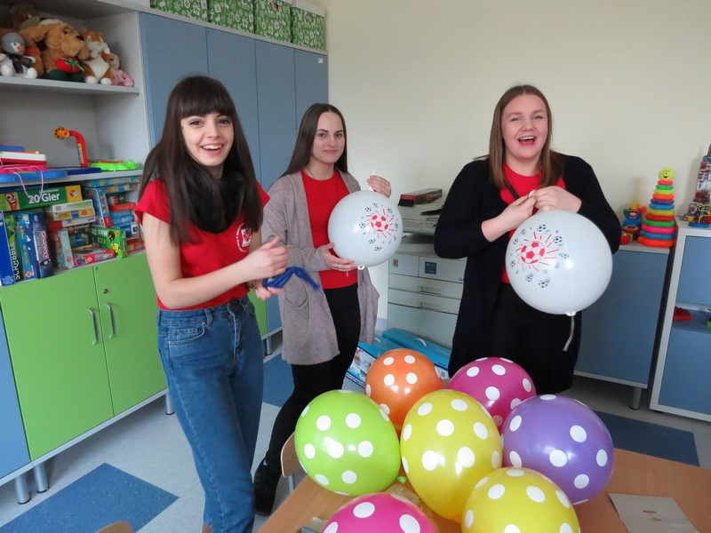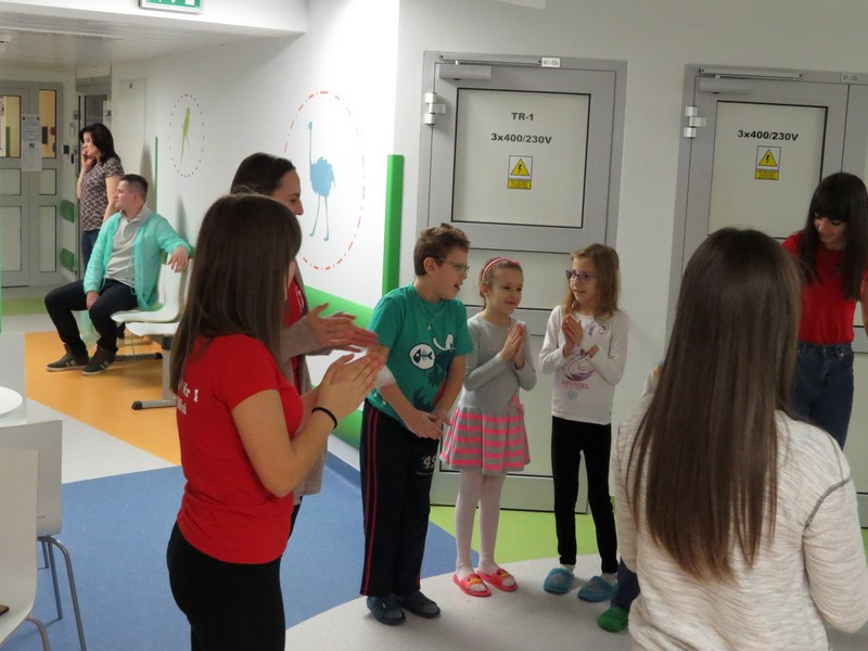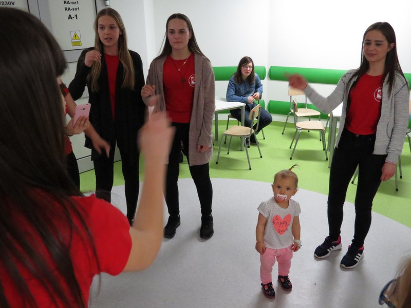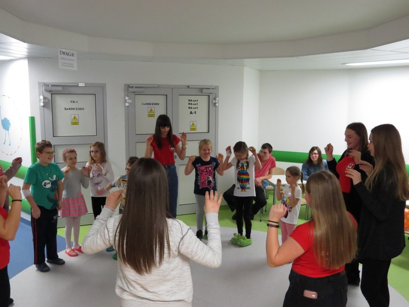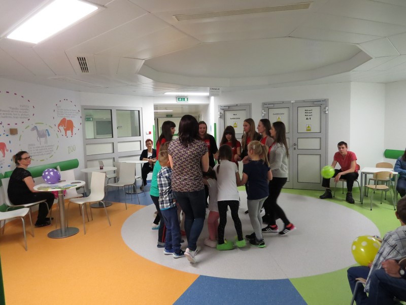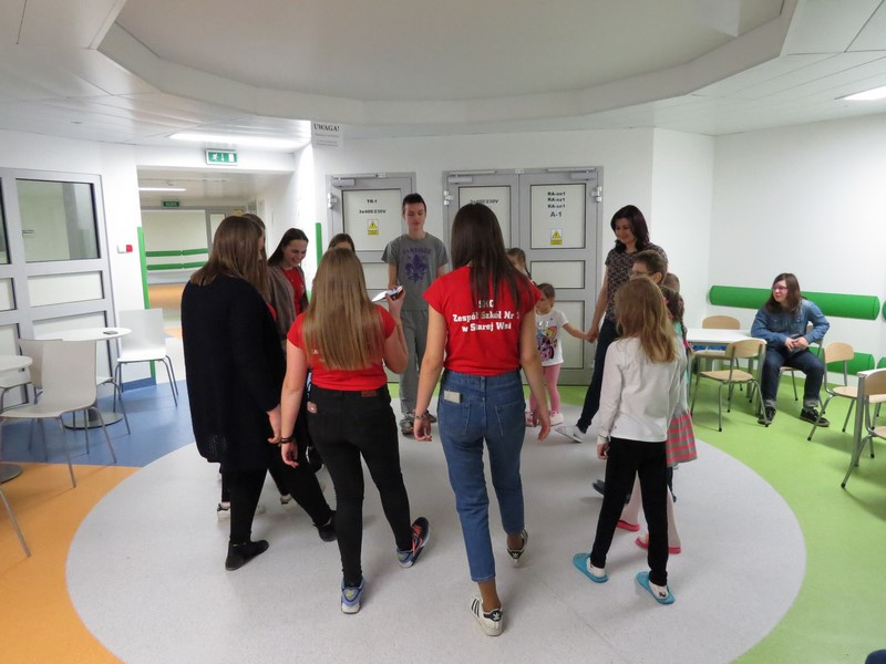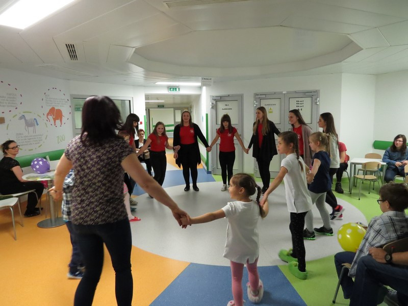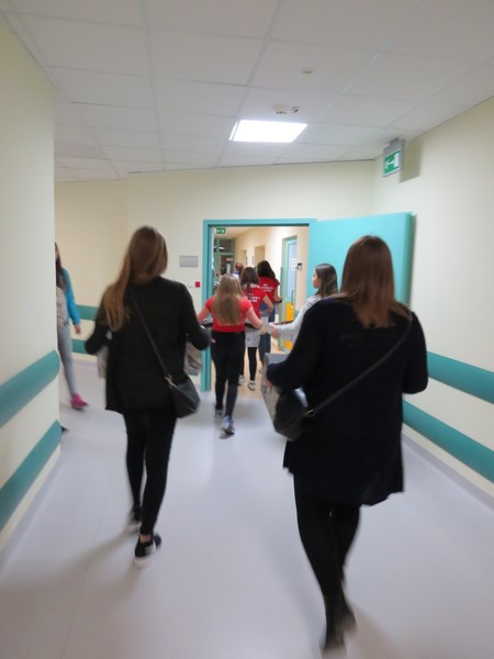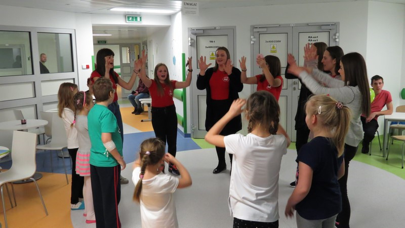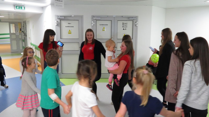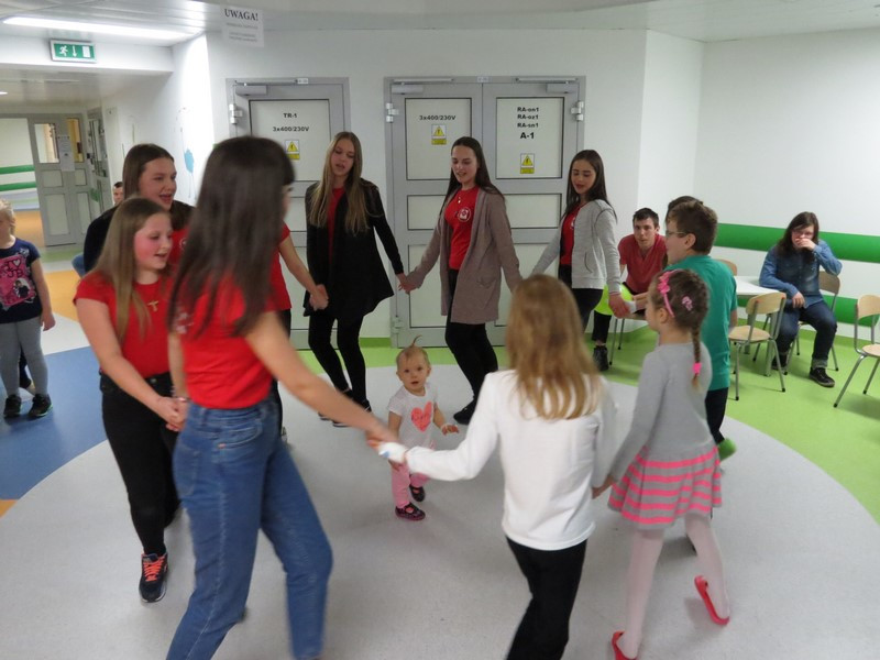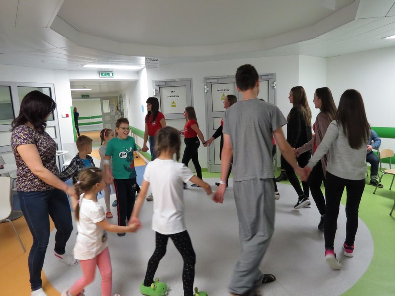 Część dzieci i młodzieży mogła na chwilę opuścić swoje łóżka i udać się na szpitalny hol, gdzie wspólnie z wolontariuszkami radośnie spędzały czas tańcząc, śpiewając piosenki i słuchając czytanych wierszy.