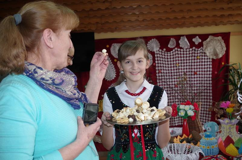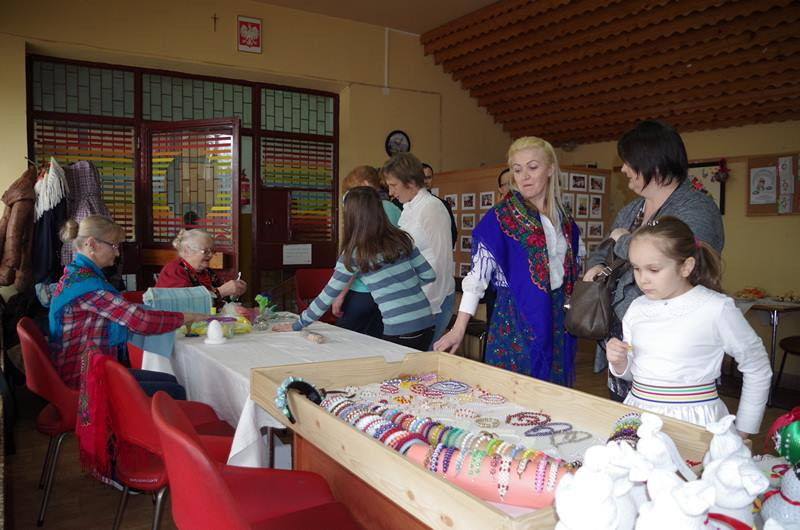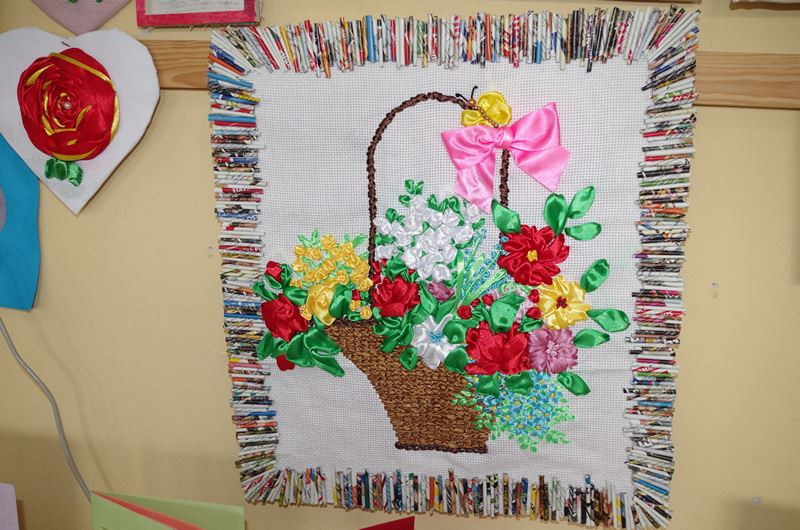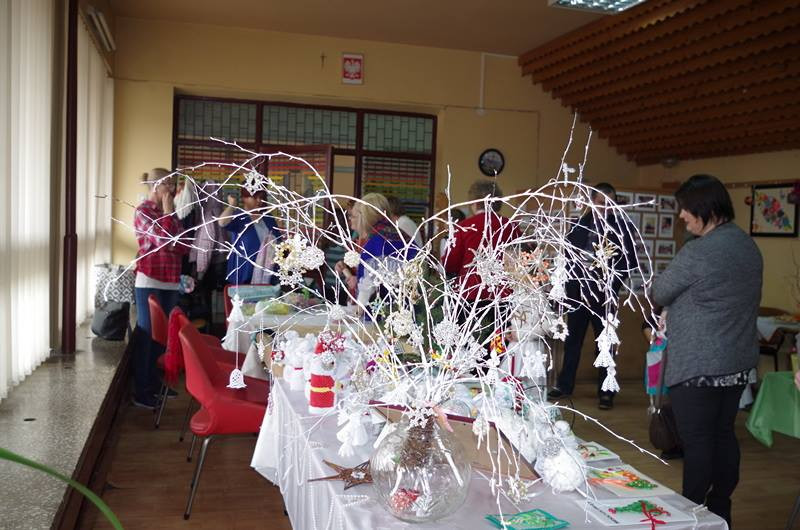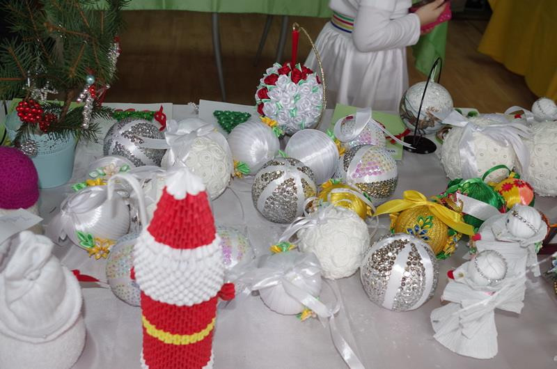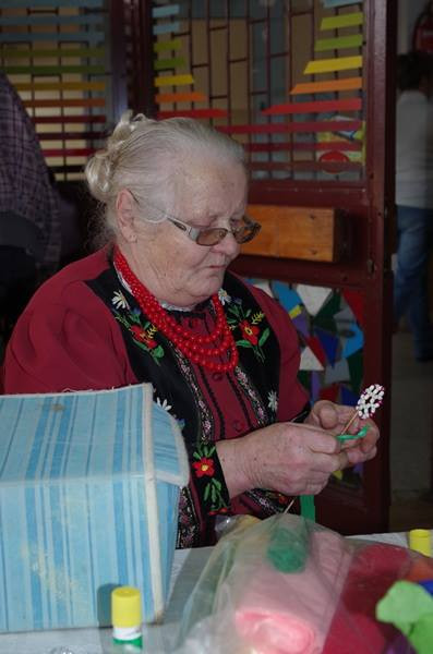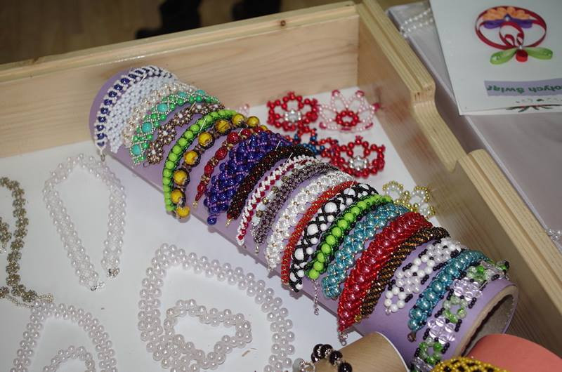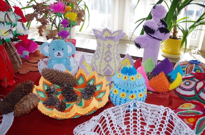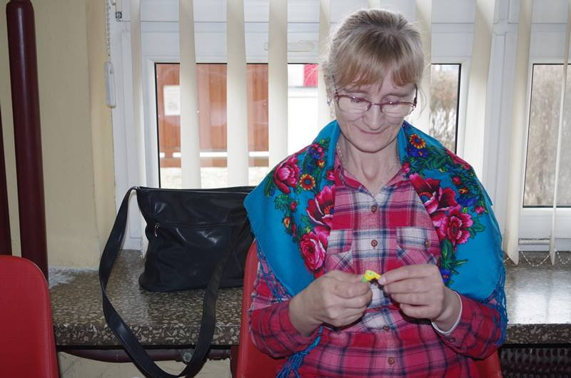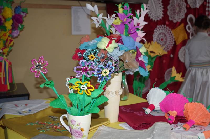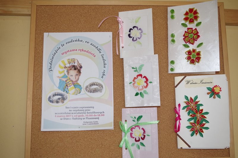 Rok temu wykluł się z Jej inicjatywy pomysł na warsztaty koralikowe dla dzieci. Ale na kolejnych zajęciach przybywało nie tylko uczestników, ale i pomysłów na techniki artystyczne, stąd tak szeroki wachlarz form wystawionych prac: wszystkie rodzaje haftu, prace szydełkowe i dziergane na drutach, orgiami, bibułkarstwo we wszelkich możliwych odmianach, biżuteria i ozdoby koralikowe, decoupage i wiele innych, czasami naprawdę innowacyjnych i autorskich technik, jak chociażby zamiana pospolitych rzeczy w dzieła sztuki: kolorowych rajstop w kwiaty, skarpet w bałwanki czy rękawiczek w stado kurczaków.
