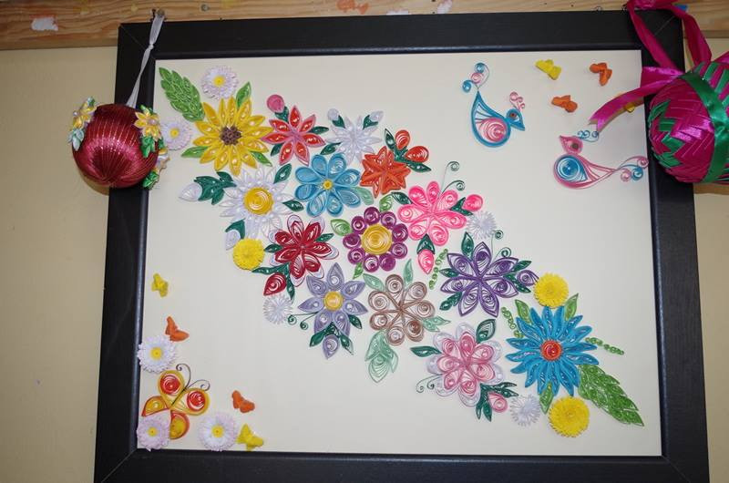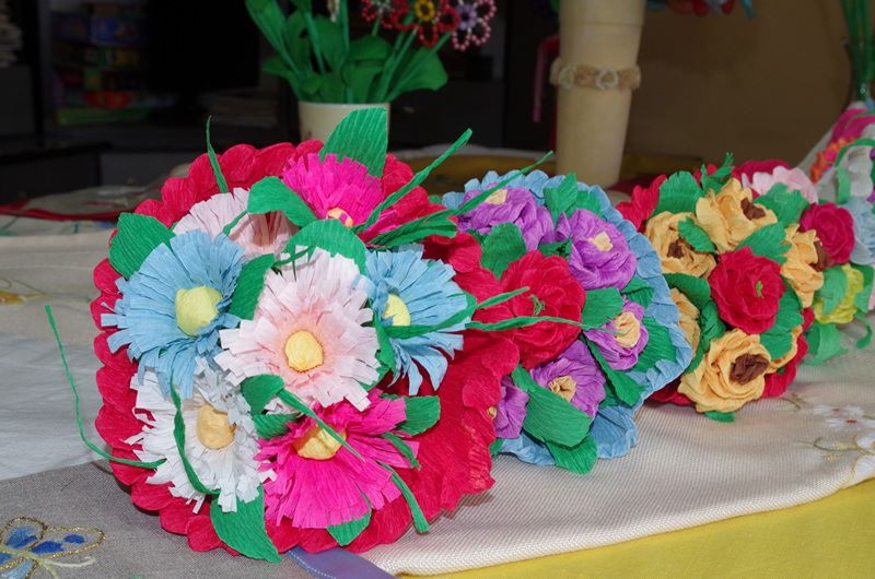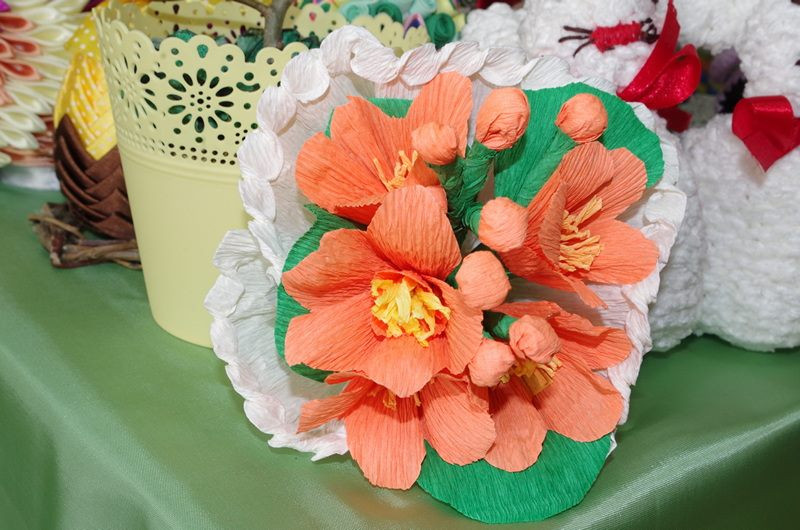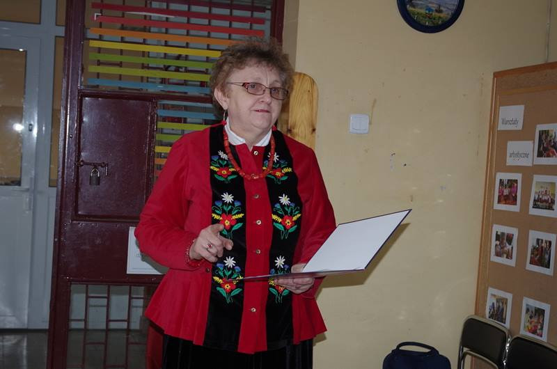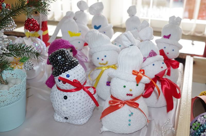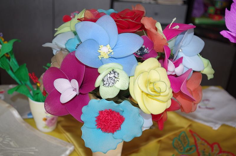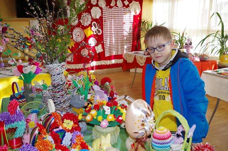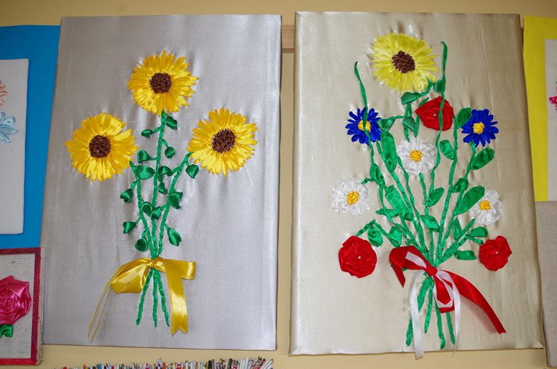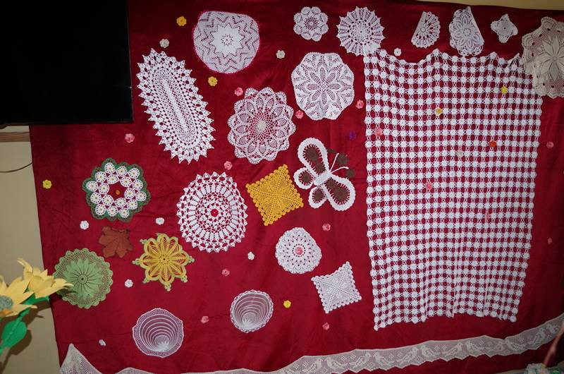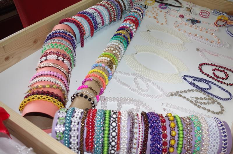 Rok temu wykluł się z Jej inicjatywy pomysł na warsztaty koralikowe dla dzieci. Ale na kolejnych zajęciach przybywało nie tylko uczestników, ale i pomysłów na techniki artystyczne, stąd tak szeroki wachlarz form wystawionych prac: wszystkie rodzaje haftu, prace szydełkowe i dziergane na drutach, orgiami, bibułkarstwo we wszelkich możliwych odmianach, biżuteria i ozdoby koralikowe, decoupage i wiele innych, czasami naprawdę innowacyjnych i autorskich technik, jak chociażby zamiana pospolitych rzeczy w dzieła sztuki: kolorowych rajstop w kwiaty, skarpet w bałwanki czy rękawiczek w stado kurczaków.