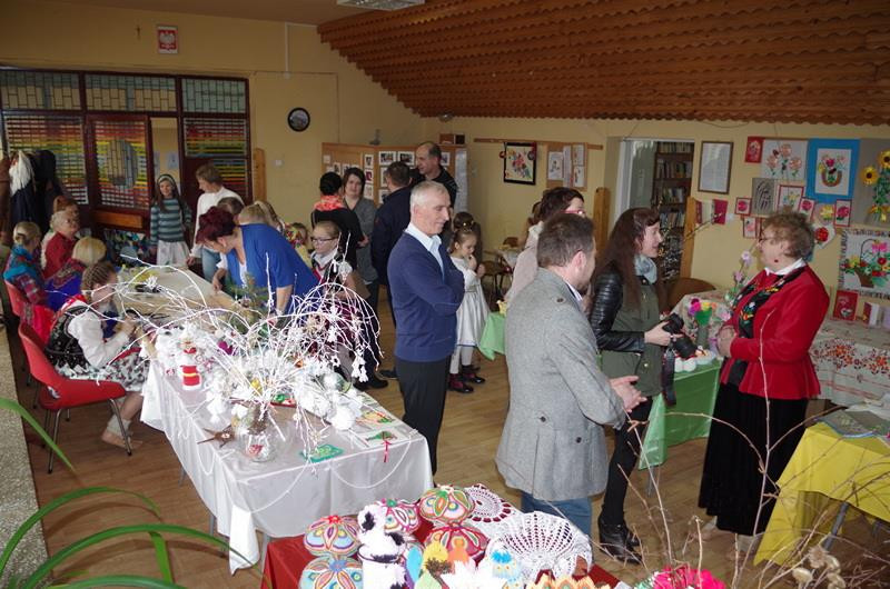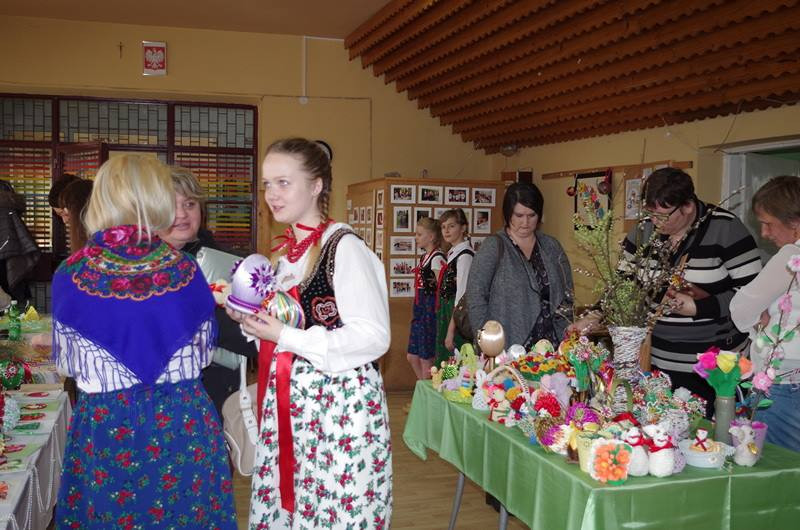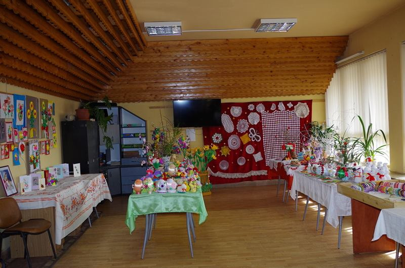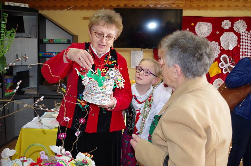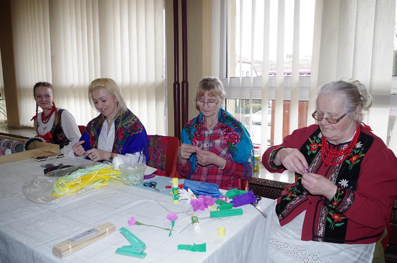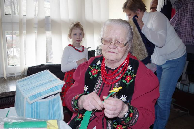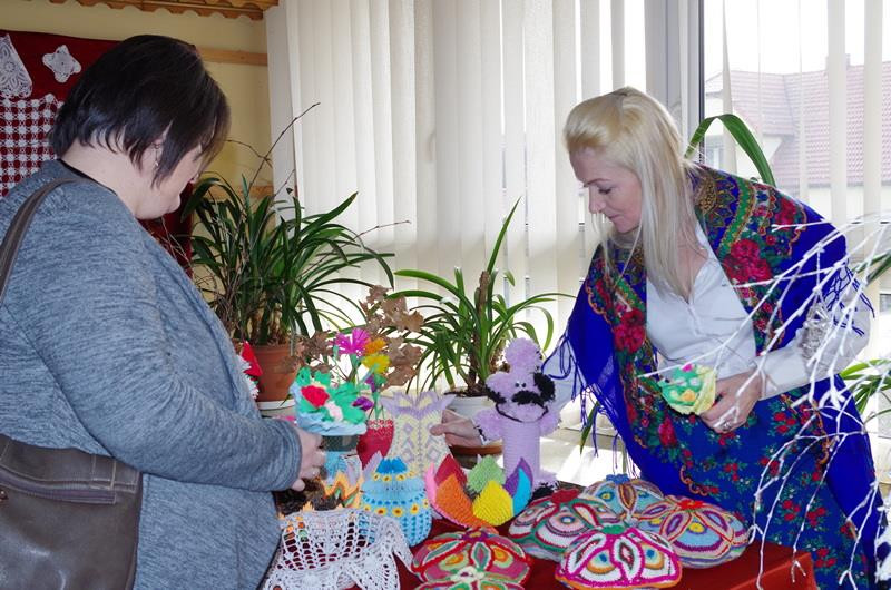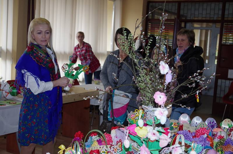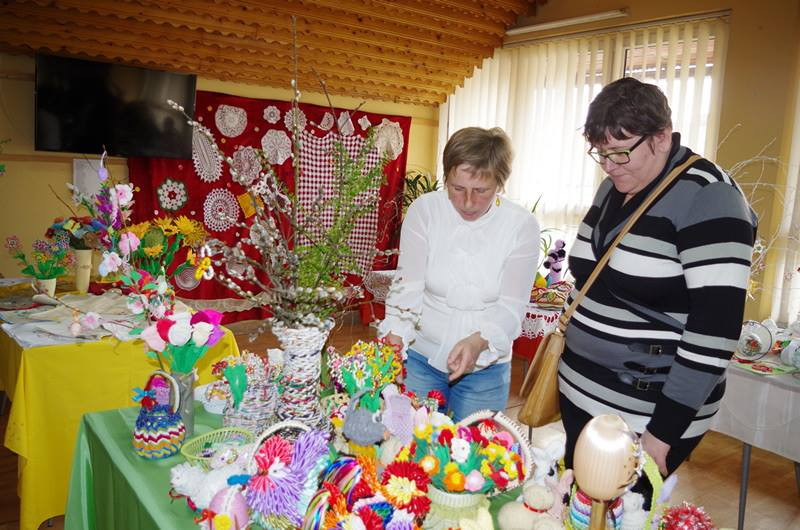 Na wystawie było tłoczno, sympatycznie, kolorowo i … ciasno! Przygotowane stanowiska w formie czterech pór roku zapełniły się błyskawicznie pracami uczestników, zarówno tymi tworzonymi na warsztatach, jak i wypracowanymi w domu, dzięki czemu Goście, odwiedzający wystawę, po prostu nurkowali w bogactwie formy i treści, bez możliwości wynurzenia się na powierzchnię przed upływem godziny. Atrakcyjność wystawy jest poza wszelką dyskusją, wystarczy obejrzeć zdjęcia. Ale jak pracochłonna praca poprzedza te cudeńka, demonstrowały Panie: Antonina Lubera, Sabina Frączek i Marta Pawłowska, które na żywo, w kilku różnych technikach rękodzielniczych, tworzyły unikatowe dzieła sztuki.