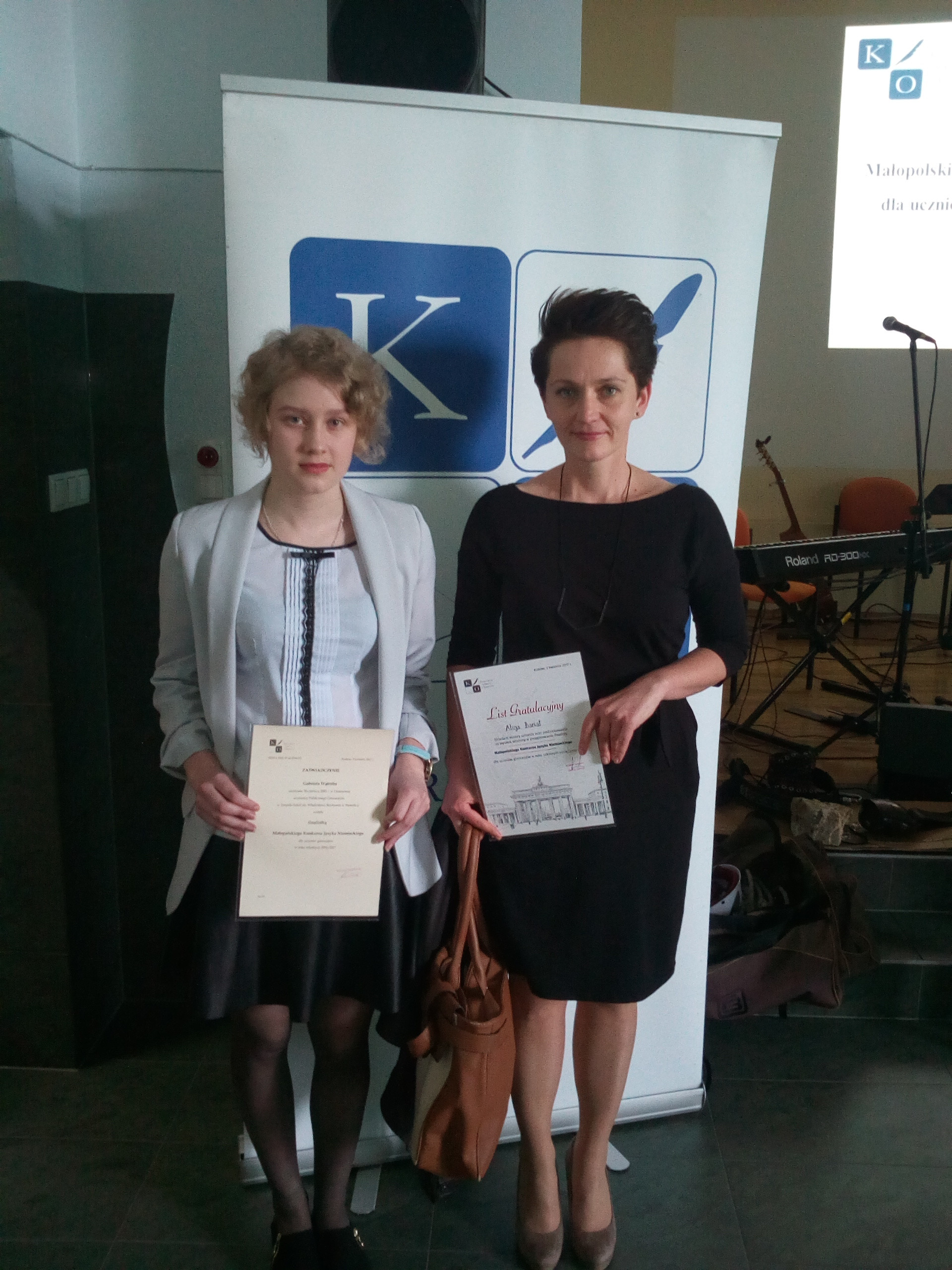 Uczennica znalazła się w grupie 57 gimnazjalistów osiągających najlepsze wyniki w nauce języka niemieckiego w Małopolsce. Konkurs jest trudny, gdyż nie nawiązuje swoją tematyką do konkretnego zagadnienia, a sprawdza przekrojową wiedzę uczniów z zakresu podstawy programowej, niejednokrotnie wykraczając poza ten obszar. Aby zostać finalistką, trzeba było zakwalifikować się po etapie szkolnym do etapu rejonowego i zdobyć co najmniej 85 %, a na etapie wojewódzkim nie miej niż 50% punktów z możliwych do uzyskania. Podkreślić należy, że jest to jedyna uczennica z powiatu limanowskiego, która w tym konkursie uzyskała tytuł finalisty.