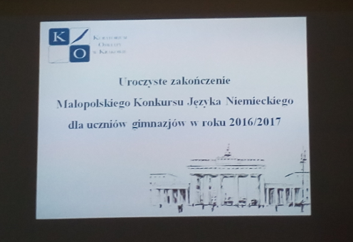 3 kwietnia 2017 r. w Centrum Doskonalenia Nauczycieli w Nowym Sączu, odbyło się uroczyste zakończenie Małopolskiego Konkursu Języka Niemieckiego dla uczniów gimnazjum, którego organizatorem jest Kuratorium Oświaty w Krakowie.