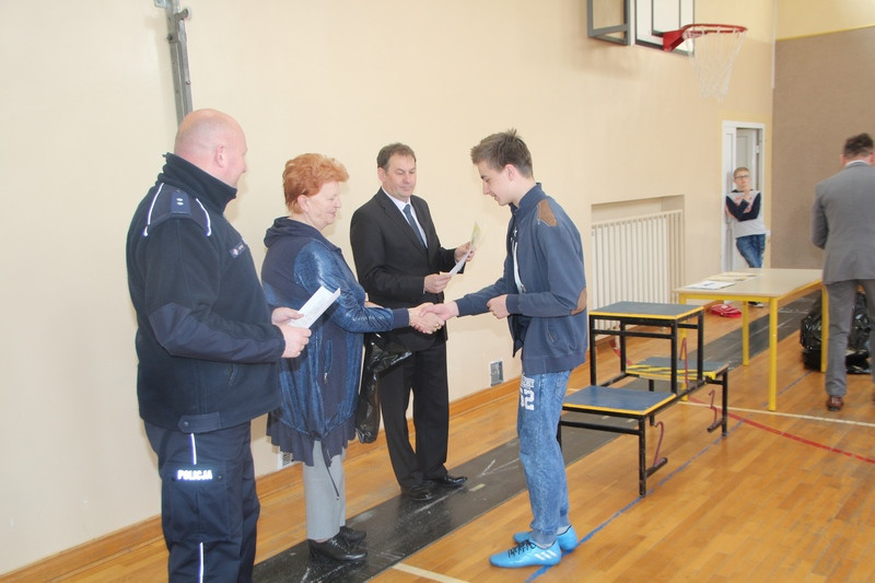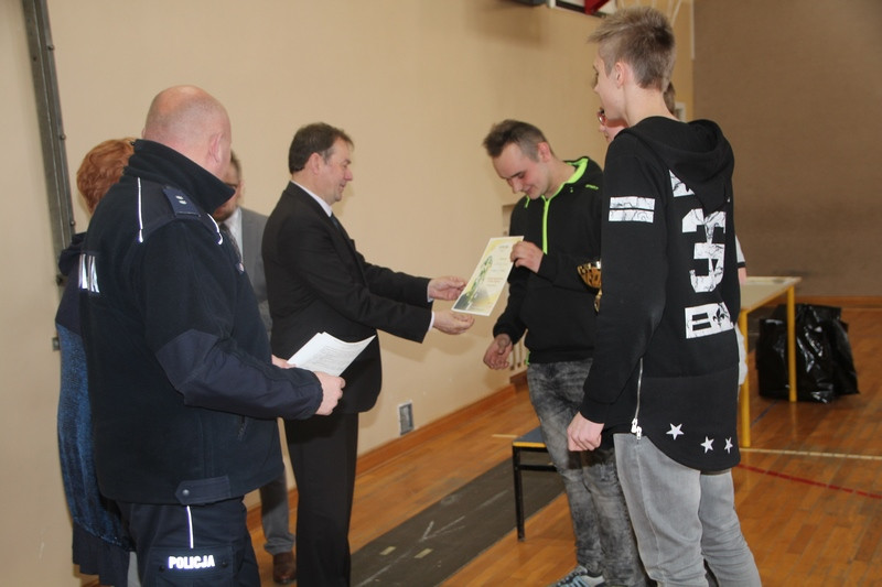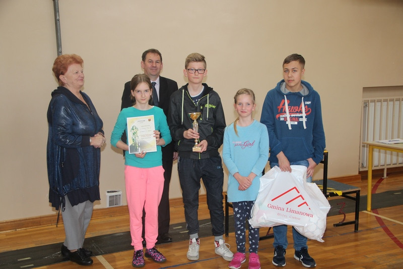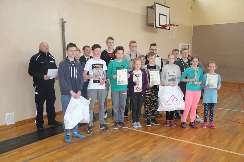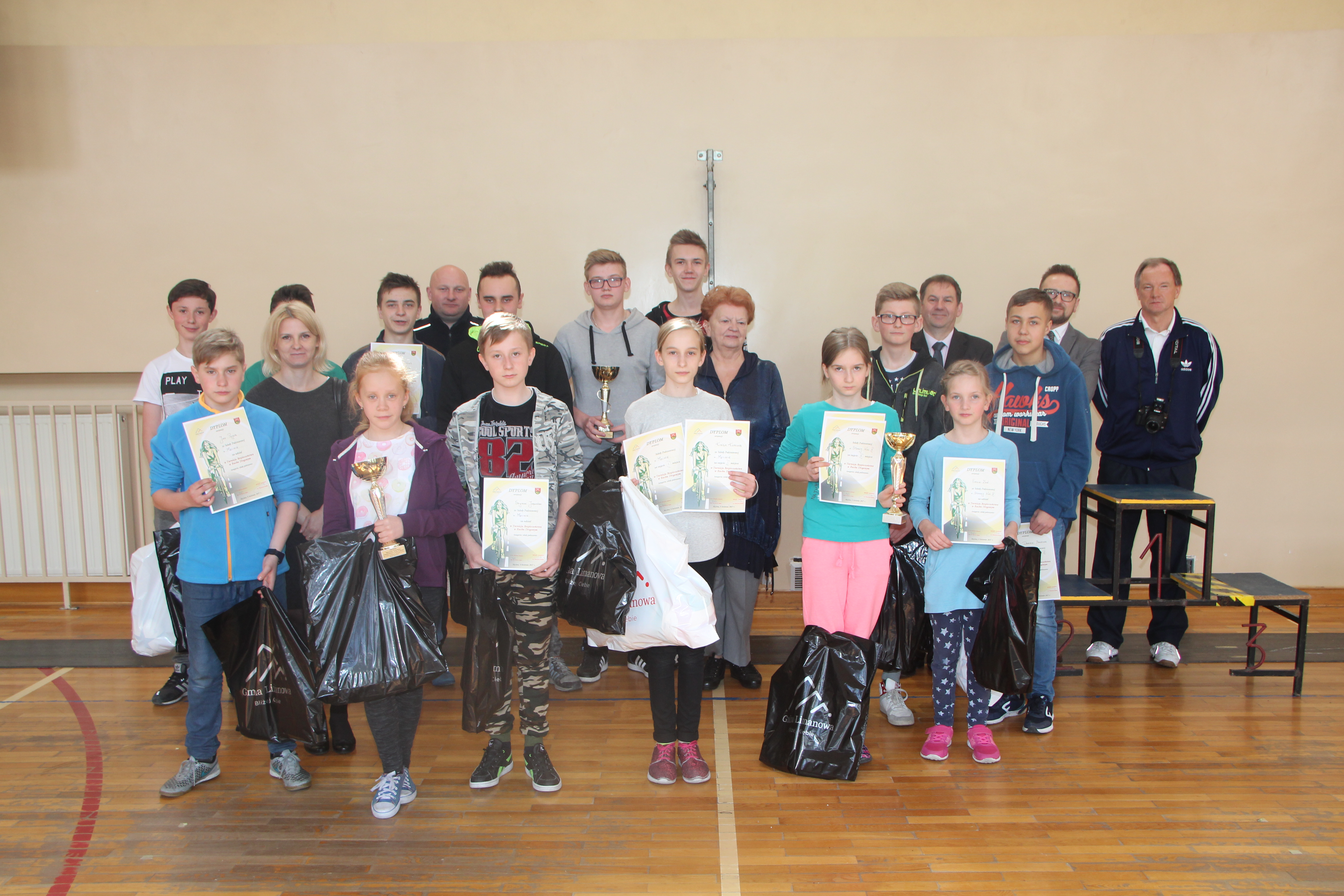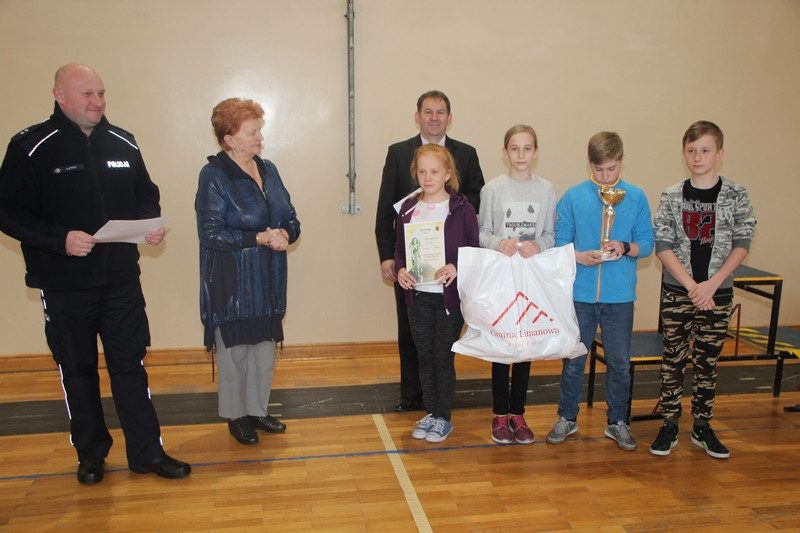 Wszyscy uczestnicy Turnieju zarówno drużynowo, jak i indywidualnie otrzymali dyplomy oraz nagrody rzeczowe ufundowane przez Urząd Gminy Limanowa. Nagrody wręczali: Wice Wójt Gminy Limanowa – Marian Mąka, Kierownik Wydziału Kultury i Promocji UG Limanowa – Wojciech Korabik, Dyrektor Zespołu Szkół nr 1 w Męcinie - Maria Lupa oraz podkomisarz Daniel Strug z KPP Limanowa.