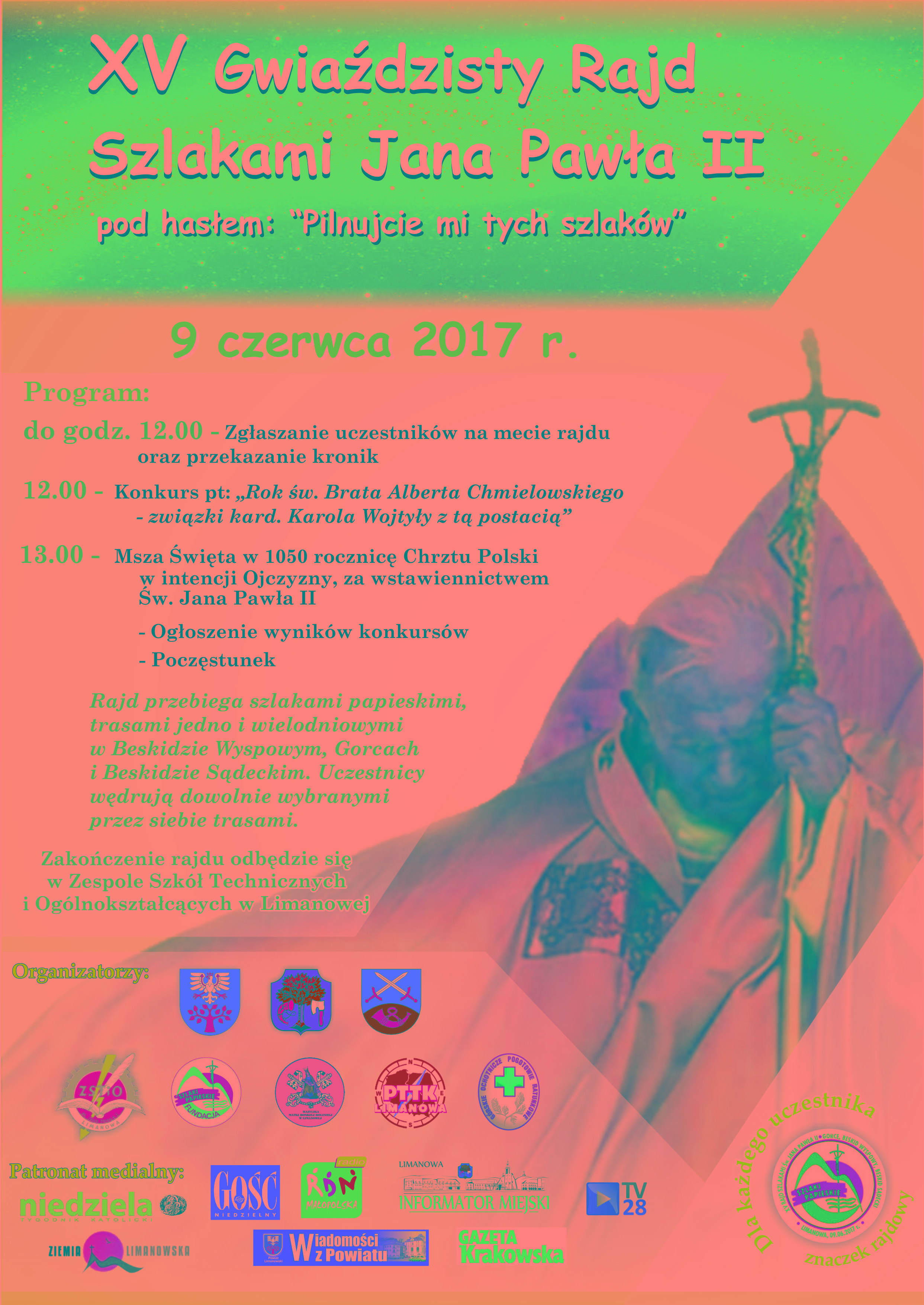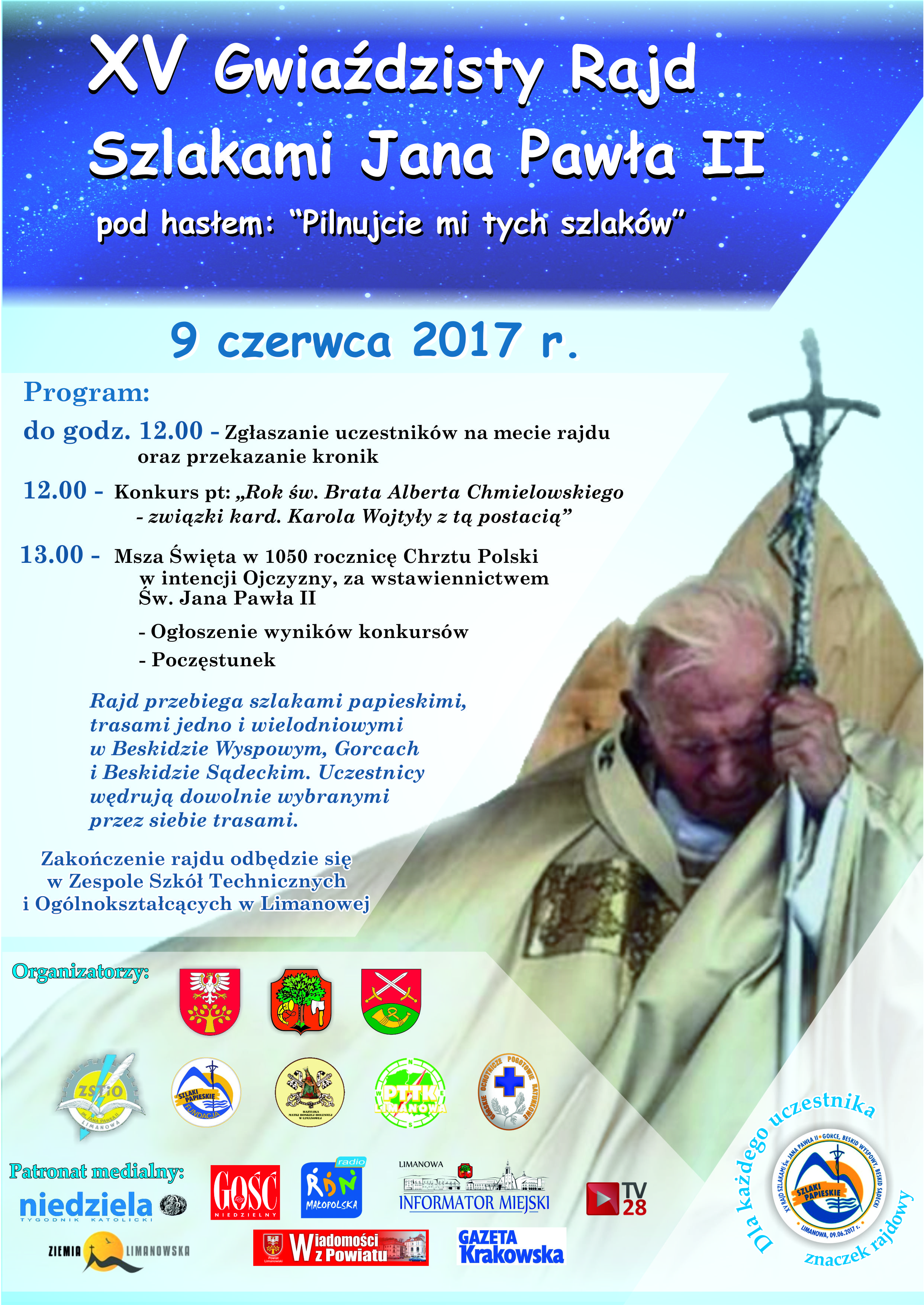 Pod hasłem „Pilnujcie mi tych szlaków” organizowany jest po raz piętnasty Gwiaździsty Rajd Szlakami Świętego Jana Pawła II. W Rajdzie mogą uczestniczyć: drużyny do 10 osób, młodzież szkolna pod opieką nauczyciela oraz osoby indywidualne. Uroczyste podsumowanie Rajdu odbędzie się dnia 9 czerwca 2017 r. przy Zespole Szkół Technicznych i Ogólnokształcących w Limanowej, ul. Zygmunta Augusta.