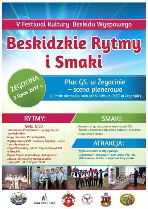 Już w sobotę - 1 lipca w Dobrej /park przy Urzędzie Gminy/ rozpocznie się V Festiwal Kultury Beskidu Wyspowego „Beskidzkie Rytmy i Smaki”. Na scenach dziesięciu miejscowości Beskidu Wyspowego / Dobra, Żegocina, Tenczyn ,Wiśniowa, Słopnice,Kamienica, Rabka Zdrój,Tokarnia, Raciechowice, Limanowa / w miesiącu lipcu i sierpniu br wystąpi ponad 75 zespołów muzycznych , regionalnych , kapel i orkiestr prezentując bogaty dorobek i tradycje górali Zagórzan, Kliszczaków, Białych Górali, Podhalan i Lachów. Specjalne stoiska i kiermasze z regionalnymi wyrobami oraz przysmakami przygotują Koła Gospodyń Wiejskich. Odbędą się liczne konkursy , wystawy i prezentacje kultury Beskidu Wyspowego.