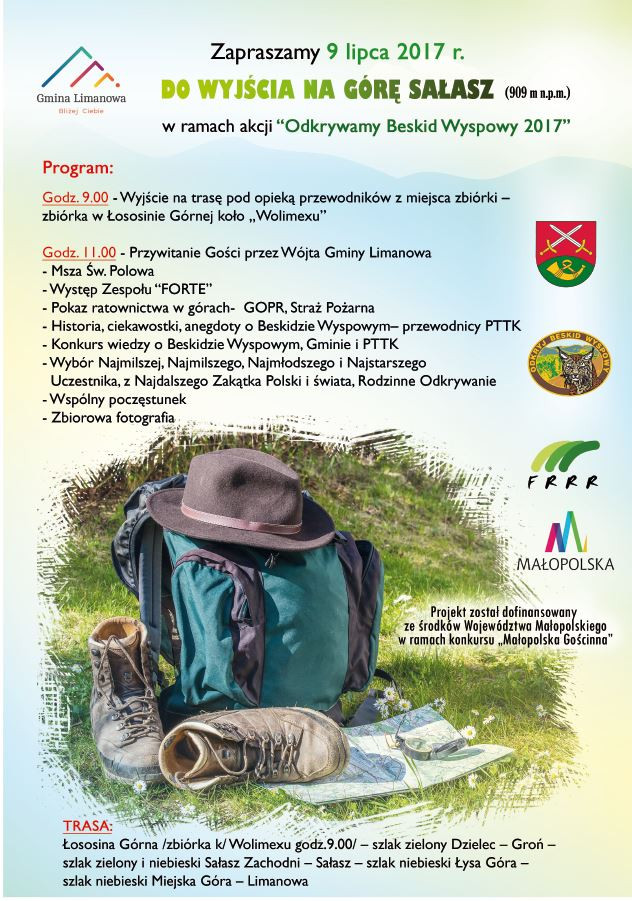 Już w najbliższą niedzielę tj. 9 lipca w ramach akcji „Odkryj Beskid Wyspowy 2017” turyści zdobywać będą górę Sałasz. Wędrówka rozpocznie się o godz.9.00 - zbiórka w Łososinie Górnej koło „Wolimexu”. Po wyjściu na szczyt odbędzie się msza św., konkursy i wspólny poczęstunek, a całości przygrywał będzie Zespół „FORTE”. Organizatorem wyprawy jest Urząd Gminy w Limanowej.