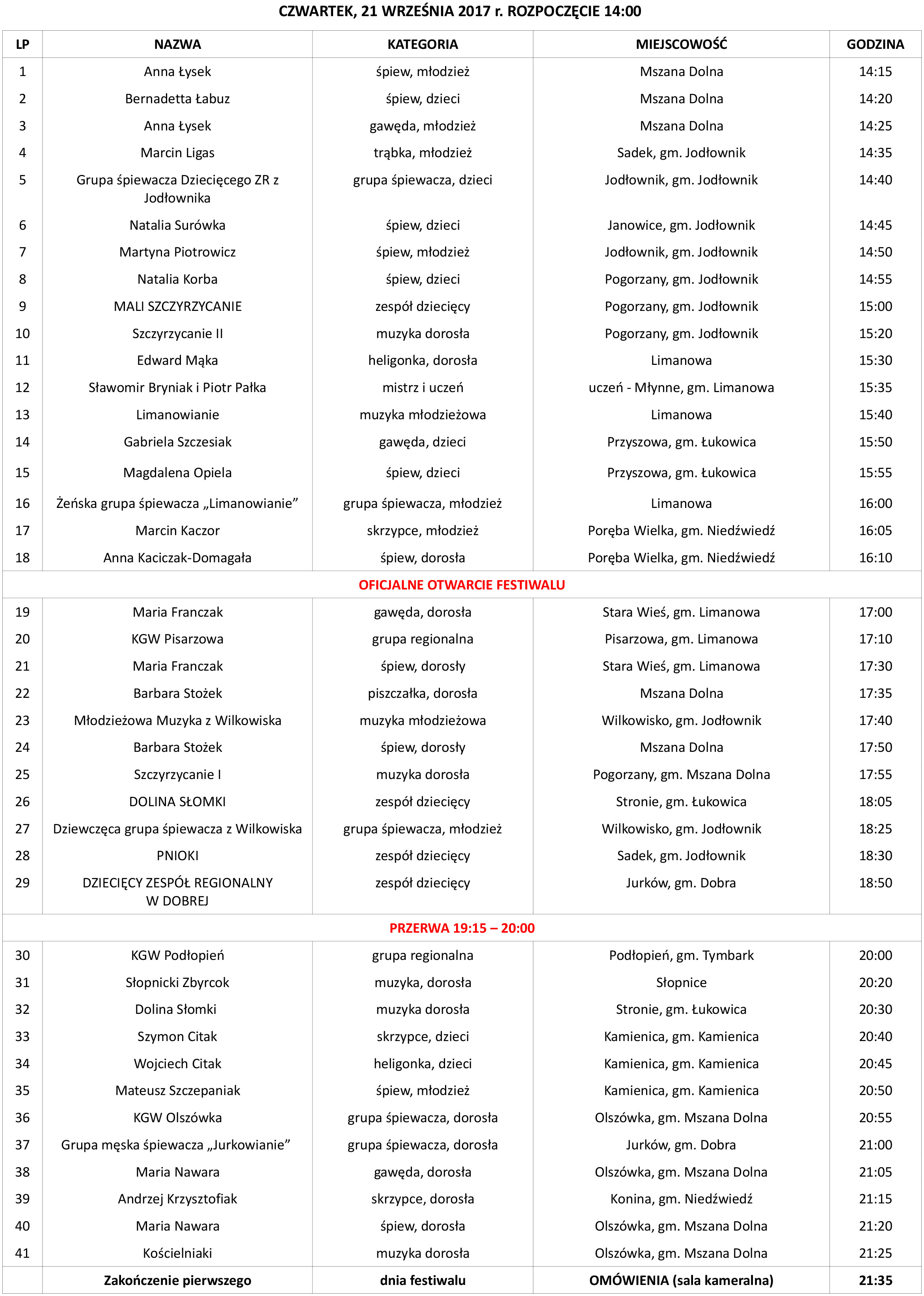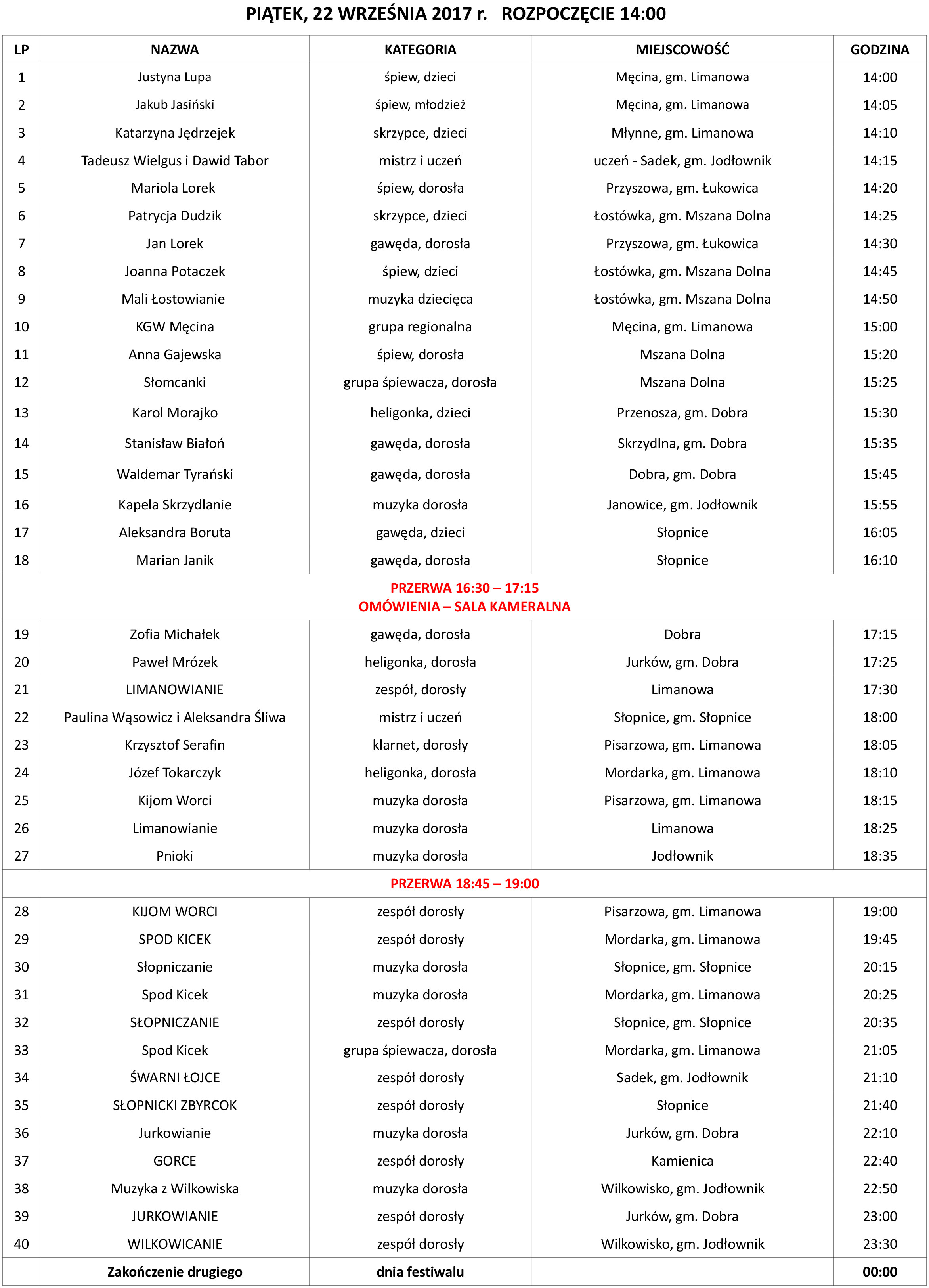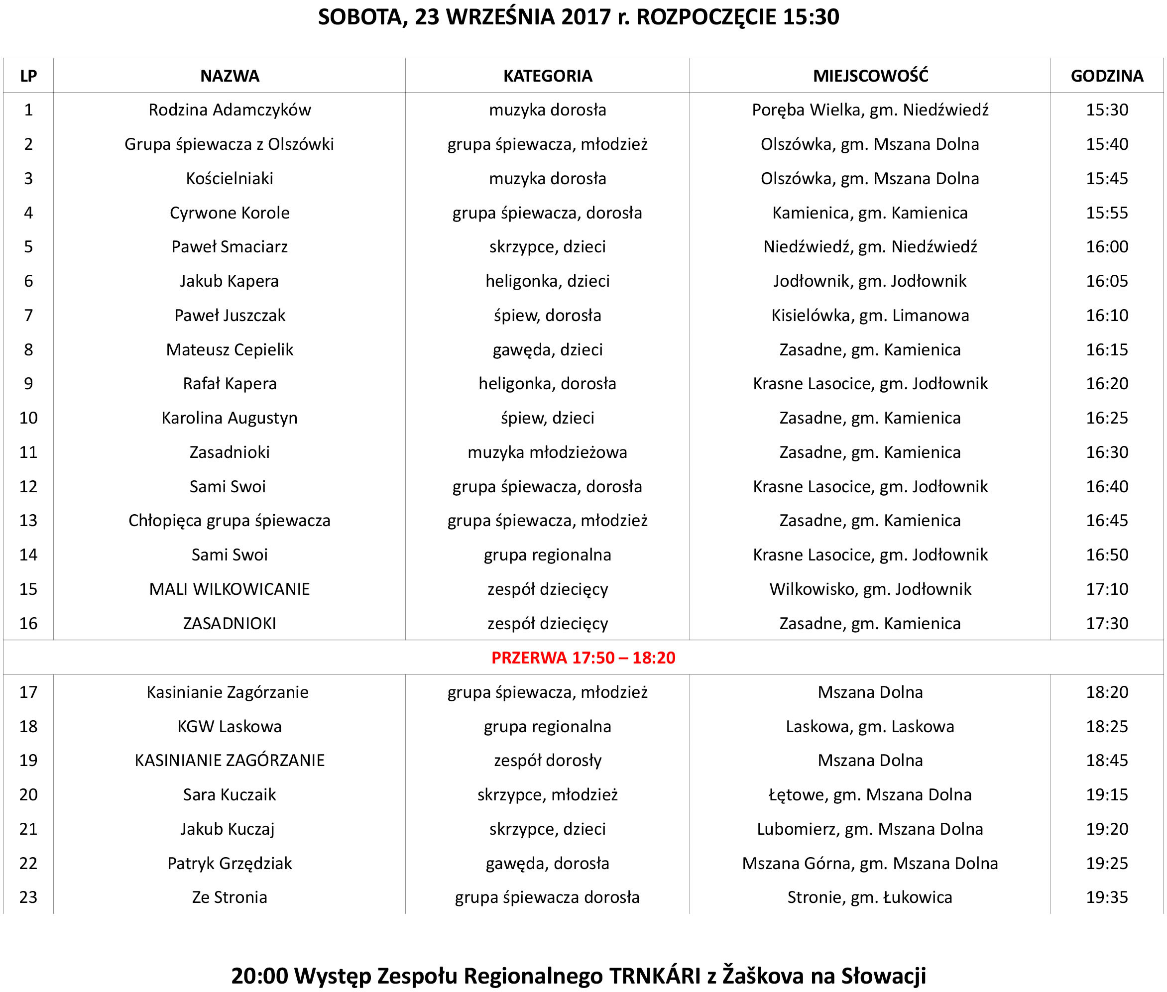 - "Kijom Worci" z Pisarzowej /kat. zespół dorosły/ - godz. 19.00