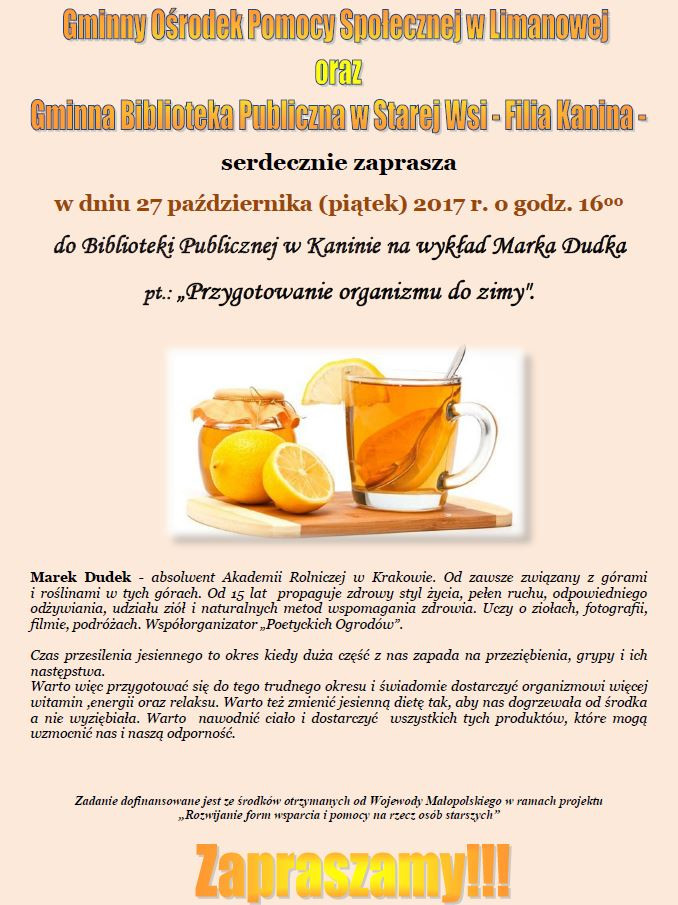 Natomiast dzień później,  w dniu 27 października (piątek) 2017 r. o godz. 16:00  w  Bibliotece Publicznej w Kaninie odbędzie się wykład Marka Dudka pt.:  „Przygotowanie organizmu do zimy".