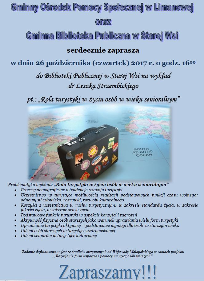 Gminny Ośrodek Pomocy Społecznej w Limanowej  oraz Gminna Biblioteka Publiczna w Starej Wsi  serdecznie zaprasza w dniu 26 października (czwartek) 2017 r. o godz. 16:00 do Biblioteki Publicznej w Starej Wsi na wykład  dr Leszka Strzembickiego pt.: „Rola turystyki w życiu osób w wieku senioralnym”
