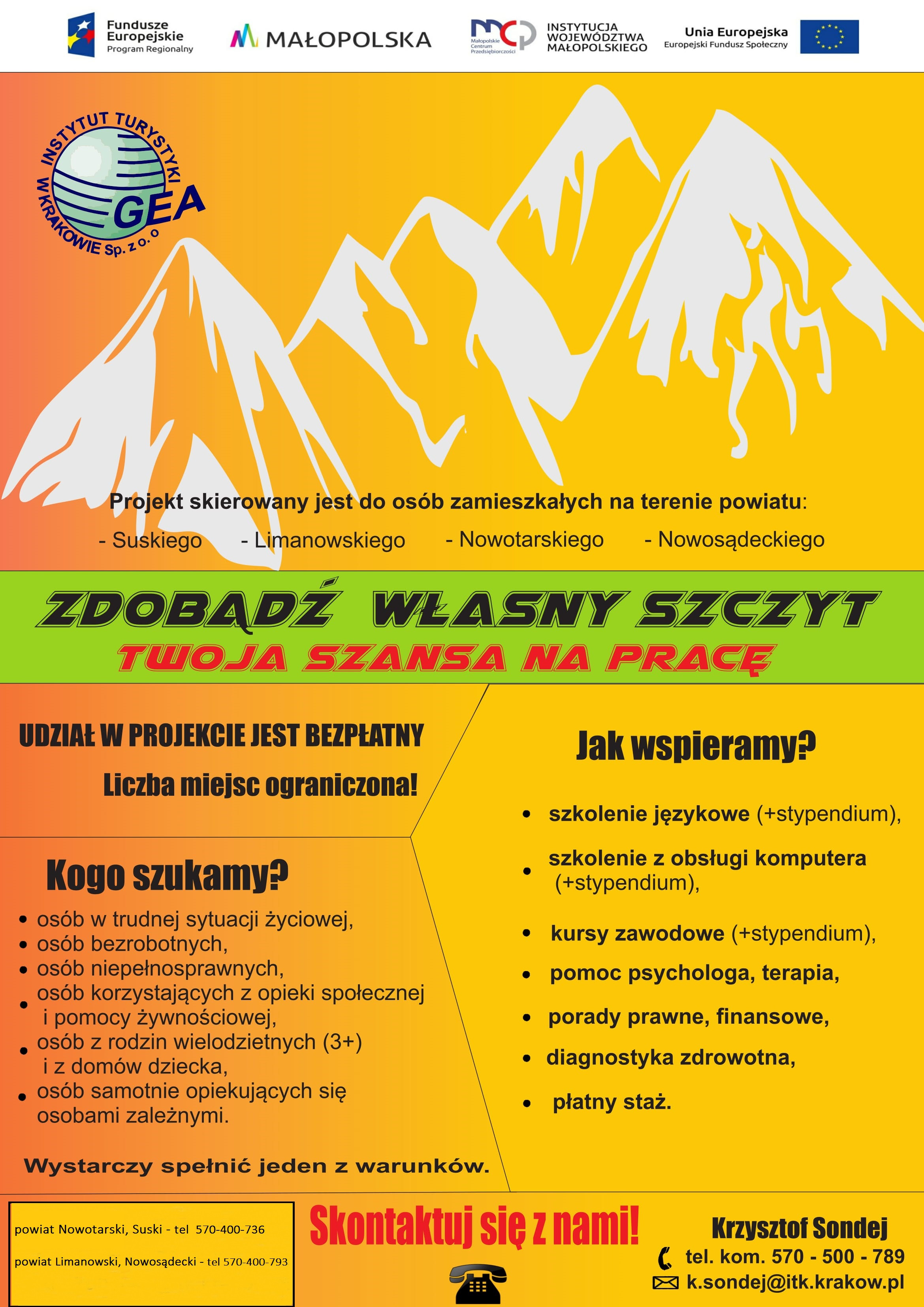 Instytut Turystyki Sp. Z.o.o. w Krakowie do udziału w projekcie: „Zdobądź własny szczyt- nowe podejście do aktywizacji społeczno-zawodowej”, realizowanego w ramach Regionalnego Programu Operacyjnego Województwa Małopolskiego na lata 2014-2020, współfinansowane z Europejskiego Funduszu Społecznego. Celem główny naszych działań będzie aktywizacja zawodowa i społeczna osób zagrożonych ubóstwem lub wykluczeniem społecznym zamieszkałych w powiecie Nowotarskim, Sądeckim, Limanowskim, Suskim oraz ich otoczenia prowadząca do zwiększenia szans na ich zatrudnienie. Ilość uczestników ograniczona. REKRUTACJA już trwa. Udział w jest w 100% bezpłatny.