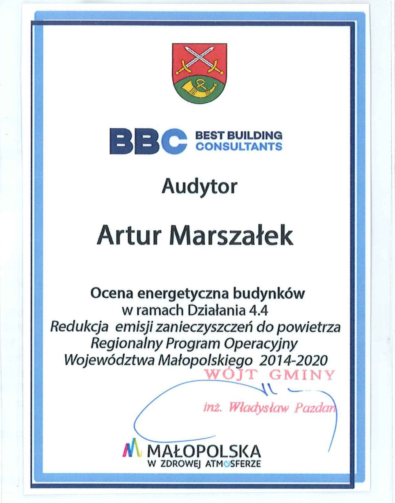 Swą wizytę audytor wcześniej potwierdzał będzie telefonicznie u danego mieszkańca. Łącznie na terenie Gminy Limanowa ocenę energetyczną budynków przeprowadzać będzie 31 audytorów, a każdy z nich wyposażony będzie w specjalny identyfikator jak poniżej dla potwierdzenia identyfikacji swojej osoby, jako upoważnionej do przeprowadzenia wizji lokalnej i audytu.