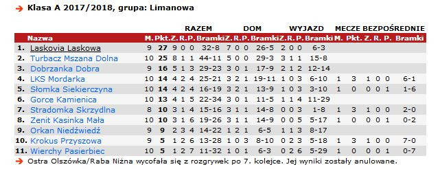 W ostatni weekend odbyły się również zaległe spotkania w limanowskiej klasie A w których Krokus Przyszowa pokonał Wierchy Pasierbiec 7:0, a LKS Mordarka zremisowała z Dobrzanką Dobra 3:3. Wśród klubów z terenu gminy Limanowa najwyższą pozycję w tabeli po zakończeniu rundy jesiennej zajmuje drużyna LKS Mordarka. Tuż za nią, z taką samą ilością punktów, ale nieco gorszym bilansem bramek znajduje się Słomka Siekierczyna. Tabelę zamyka beniaminek A klasy - drużyna Wierchów Pasierbiec.