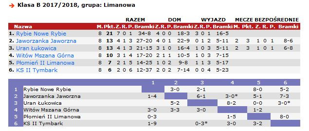 11 listopada rozegrano również zaległe spotkanie w B klasie w którym niespodziewanie Witów Mszana Górna pokonał lidera limanowskiej B Klasy - LKS Rybie 3:0. Była to jedyna porażka Rybia w całej rundzie, więc jesienne rozgrywki kończy na pierwszym miejscu tabeli limanowskiej B klasy.