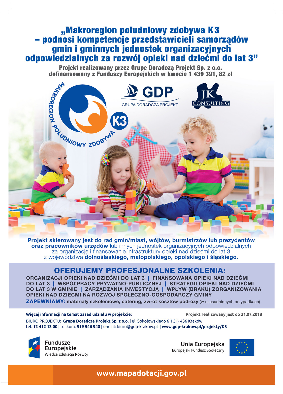 Grupa Doradcza Projekt Sp. z o.o. ma zaszczyt zaprosić pracowników jednostki samorządu terytorialnego oraz jej jednostek pomocniczych do udziału w bezpłatnym szkoleniu w ramach projektu pt. „Makroregion południowy zdobywa K 3 – podnosi kompetencje przedstawicieli samorządów gmin i gminnych jednostek organizacyjnych odpowiedzialnych za rozwój form opieki nad dziećmi w wieku do lat 3” realizowanego na podstawie Umowy o dofinansowanie Projektu w ramach Programu Operacyjnego Wiedza Edukacja Rozwój 2014-2020.