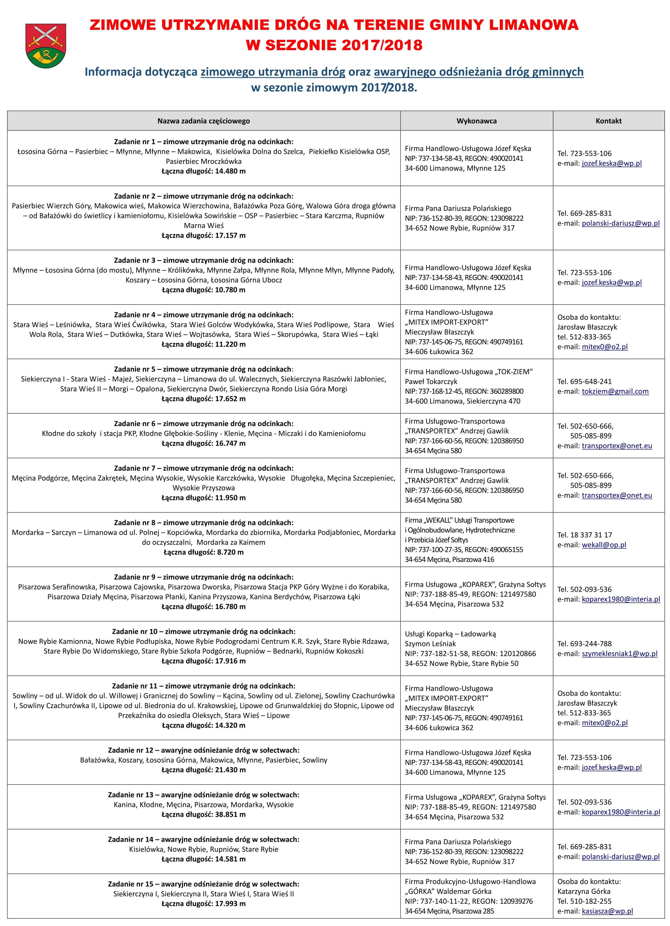Osoba odpowiedzialną z ramienia Urzędu Gminy Limanowa do kontaktu z Wykonawcami odpowiedzialnymi za utrzymanie poszczególnych odcinków dróg gminnych jest Wojciech Raczek, tel. 18/ 337 22 52 wew.144 (Wydział Gospodarki Komunalnej, Mieszkaniowej i Komunikacji UG Limanowa).