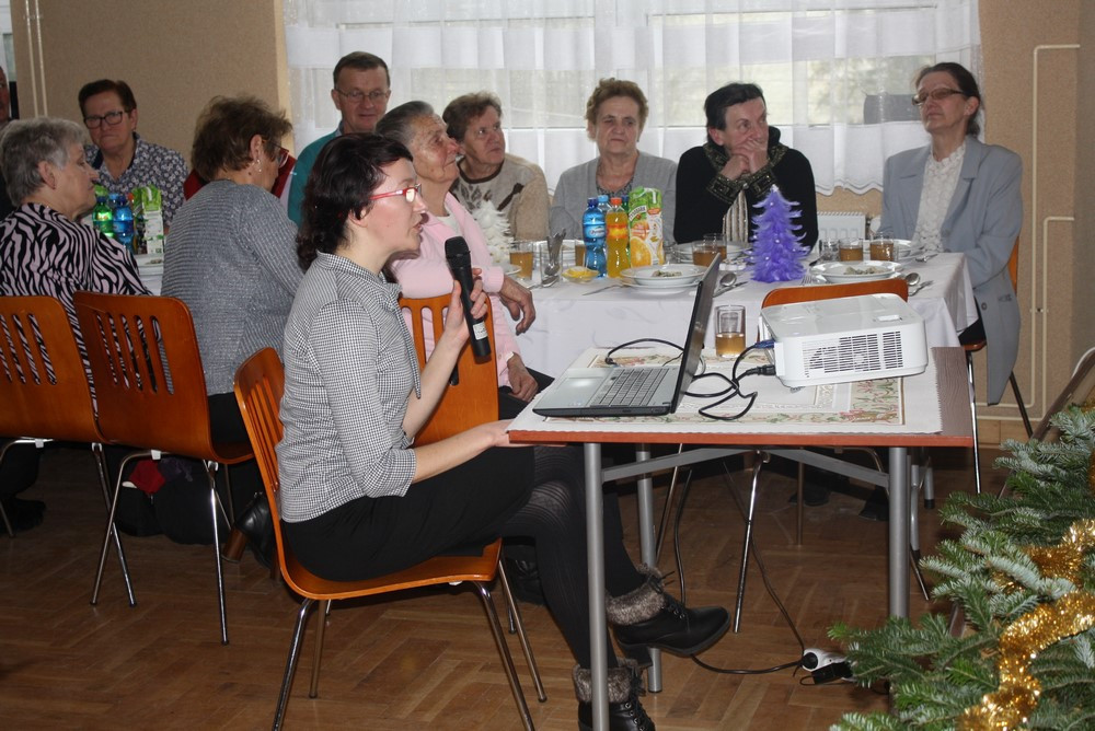 Trudno działania całoroczne streścić w kilkunastu minutach, opowiedzieć o realizowanych spotkaniach i oddać atmosferę wrażeń. Kierownik Gminnego Ośrodka Pomocy Społecznej Dorota Musiał dokonała tego podsumowania, zawierając bogaty w treść przekaz w krótkim wystąpieniu: z ogromną radością mogę powiedzieć, że działo się bardzo dużo. W ciągu sześciu miesięcy zrealizowaliśmy 46 zadań, w których udział wzięło 1970 uczestników. Mam nadzieję, że w sercach i umysłach uczestników projektu pozostaną niezwykłe doznania i wspomnienia, chociażby wyjazd do Wadowic – miejsca narodzin Największego z Polaków Jana Pawła II, seminarium Doliną Popradu – Ogród Zmysłów w Muszynie, Ogrody Biblijne, Ucztą duchową był wyjazd i udział w występie Mazowsza –wspaniałego zespołu artystycznego i to w dniu wyjątkowym 11 listopada. Fenomenalni artyści dali wspaniały koncert, który pozostanie na długo w naszych sercach. W trosce o zdrowie zorganizowaliśmy wyjazd na termy do Chochołowa oraz zajęcia rekreacyjno-ruchowe na basenie w Limanowej. Byliśmy w różnych miejscach na terenie Gminy po to aby być bliżej naszych mieszkańców, aby Seniorzy mieli okazję skorzystać z wykładów o bardzo różnorodnej tematyce prowadzonych przez: ks. dr Jerzego Smolenia, dr Wandę Matras-Mastalerz, Zbigniewa Kołbę, Marka Dudka, Wiesławę Bubulę, Wojciecha Boguckiego, Marię Bujas-Łukaszewską, dr Leszka Strzembickiego, dr Annę Tyka. Nie byłoby udanych spotkań i wszystkich przedsięwzięć, gdyby nie udział Was – Kochani - Drodzy Seniorzy. Odpowiedzieliście Państwo na naszą ofertę bardzo pozytywnie, bowiem w realizowanych działaniach udział wzięło tak wielu uczestników. Dlatego kierujemy pod Waszym adresem gorące podziękowania. Proszę przyjąć wyrazy wdzięczności i szacunku – zakończyła pani Dorota. Szczegółowe działania w ramach projektu przedstawiła Maria Trzupek poprzez pół godzinną prezentację multimedialną. Bogata w zdjęcia przypomniała Seniorom wspólnie spędzone chwile i seminaryjne wyjazdy w ramach 5 zrealizowanych działań.