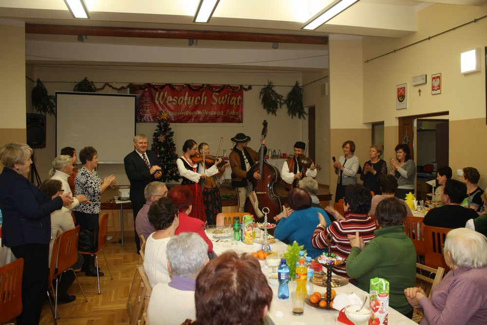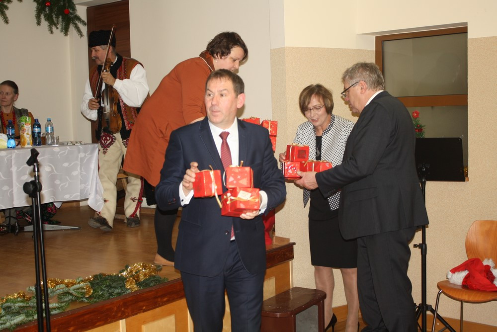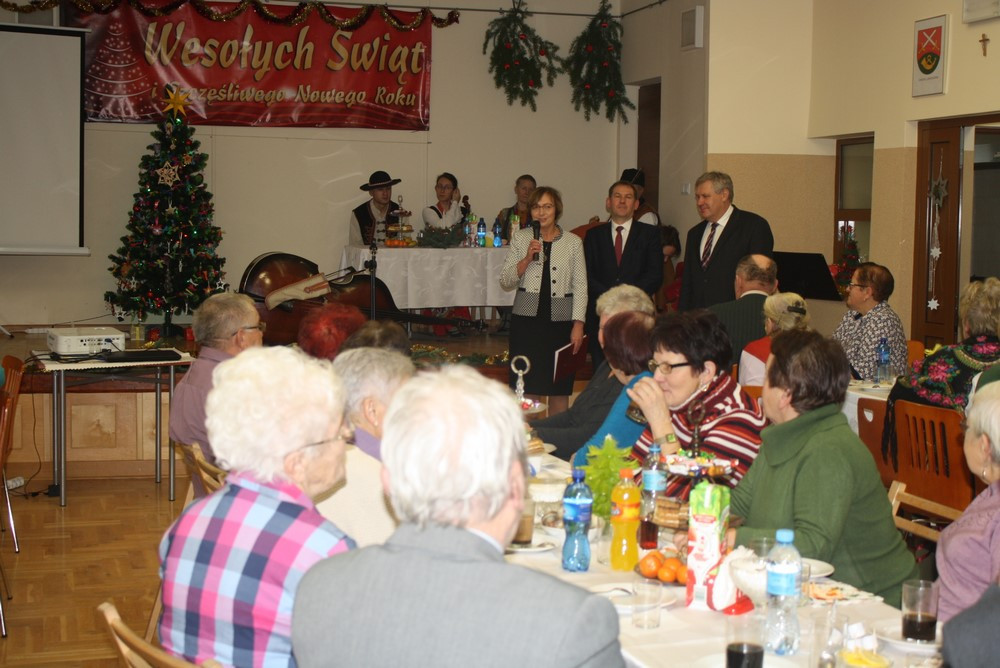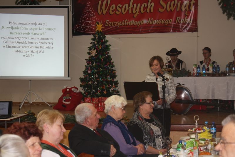 „ To już pora na wigilię to już czas” - dnia 20 grudnia br., jak w kolędzie Wandy Chotomskiej przyszedł czas na spotkanie przedświąteczne z Seniorami gminy Limanowa. Zgromadzili się z całej gminy przy wigilijnym stole, spotkali się na świątecznej uroczystości i podsumowaniu projektu pt.: „Rozwijanie form wsparcia i pomocy na rzecz osób starszych”. Projekt realizowany był w roku 2017 przez Gminę Limanowa - Gminny Ośrodek Pomocy Społecznej i Gminną Bibliotekę Publiczną w Starej Wsi, a dofinansowany był ze środków otrzymanych od Wojewody Małopolskiego. Przedświąteczne spotkanie przy końcu grudnia było doskonałą okazją do podsumowań całorocznych działań przy wspólnym stole, tradycyjnych kolędach i pastorałkach. Przygrywał, przyśpiewywał i bawił publiczność zespół muzyczny regionalistów z Łącka – Wojciech Bogucki z żoną Kazimierą i córką Alicją oraz Tomaszem Ponickim. Przywitał wszystkich donośny dźwięk dudy, potem staropolskie życzenia i najpiękniejsze polskie kolędy. Seniorów nie trzeba było namawiać do wspólnego śpiewu. Roześmiani, rozśpiewani, zintegrowani – bo przecież spotykali się cały rok na różnego rodzaju spotkaniach autorskich, warsztatach artystycznych, seminariach wyjazdowych – wszystko w ramach projektu. Uroczystość otworzył Jacenty Musiał – dyrektor Gminnej Biblioteki Publicznej w Starej Wsi słowami księdza Mieczysława Malińskiego, „miarą Twojego człowieczeństwa jest wielkość Twojej troski o drugiego człowieka”.
