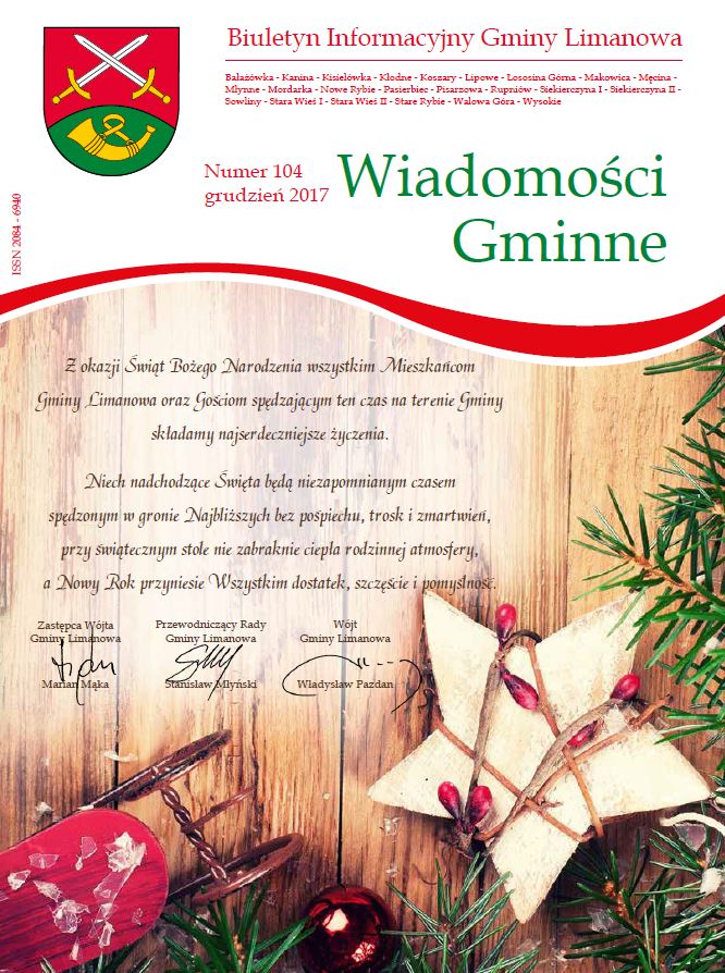 Zapraszamy Państwa do lektury świątecznego numeru Biuletynu Informacyjnego "Wiadomości Gminne". W najnowszym numerze m.in. informacje o uchwalonym na 2018 rok budżecie Gminy Limanowa, realizowanych inwestycjach, informacje dotyczące zimowego utrzymania dróg oraz odbiorze odpadów wraz z terminami wywozu śmieci w 2018 r.  Wersja elektroniczna Biuletynu  w załączniku poniżej.