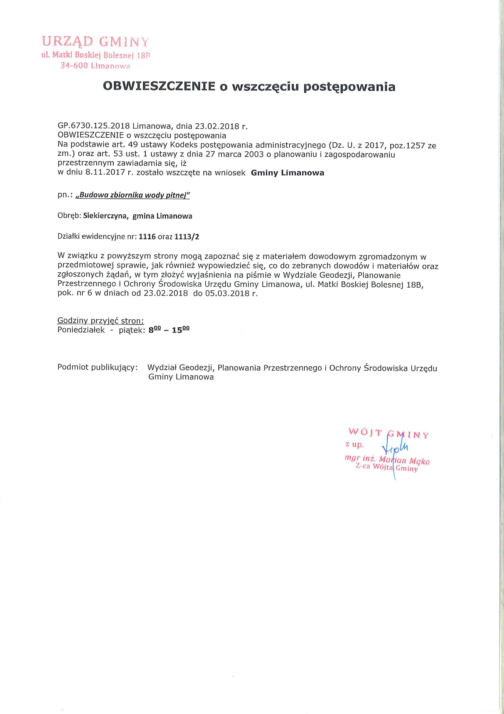 Na podstawie art. 49 ustawy Kodeks  postępowania administracyjnego (t.j. Dz. U. 2017 r. poz.1257) oraz art. 53 ust. 1 ustawy z dnia 27 marca 2003 r. o planowaniu i zagospodarowaniu przestrzennym zawiadamia się, iż  w dniu 8.11.2017 r. zostało wszczęte postępowanie na wniosek Gminy Limanowa  pn.: " Budowa zbiornika wody pitnej" - obręb - Siekierczyna , nr działki ew. 1116 oraz 1113/2.